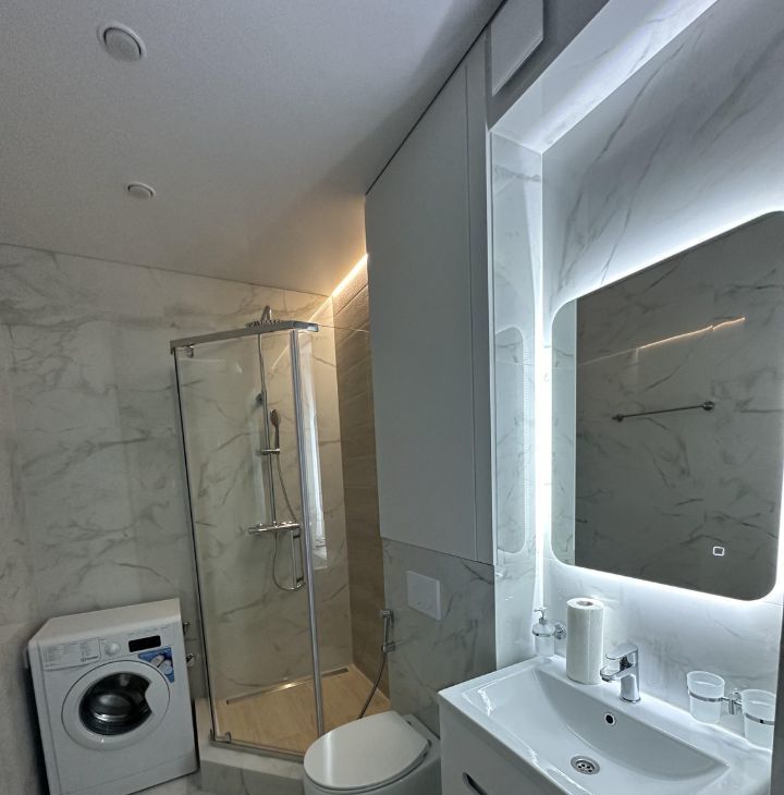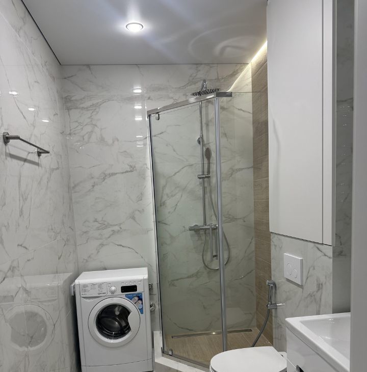 Ванная комната оснащена стиральной машиной, имеется водонагреватель в ванной, система инсталляции.