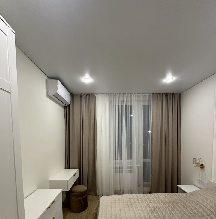 Сделана перепланировка и выделены две комнаты под спальню и гостиную.