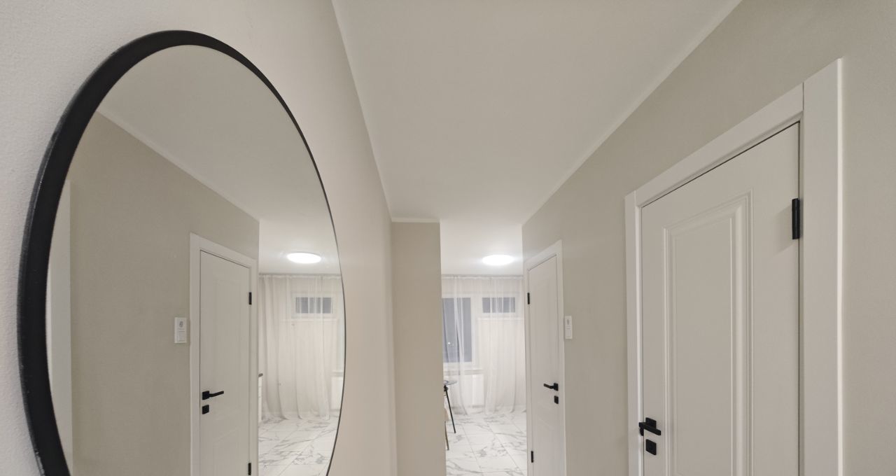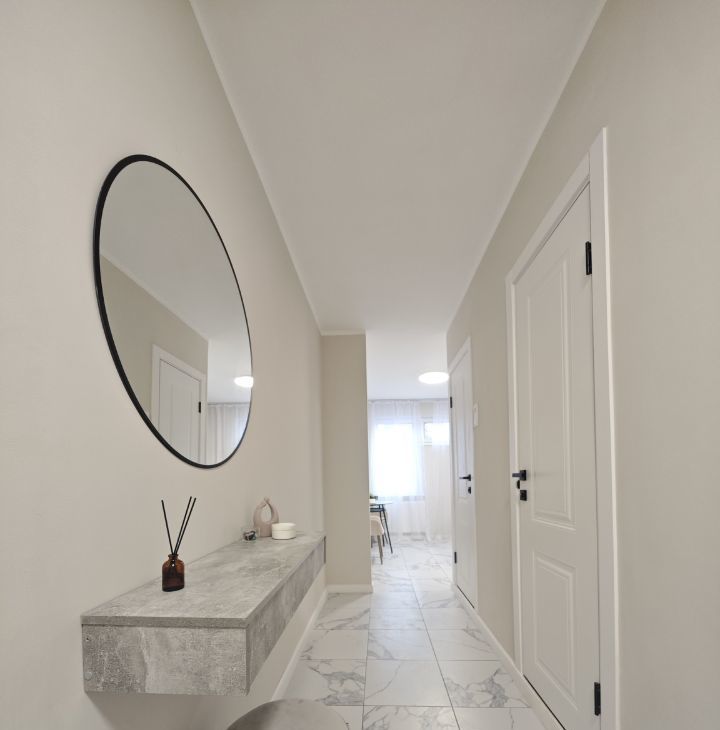 Новый ремонт из качественных материалов: ламинат в комнате, плитка на кухне, в прихожей и в санузлах, стеклопакеты в квартире и на лоджии, новые входная и межкомнатные двери, установлен новый кухонный гарнитур с сантехникой, стены и потолок покрашены - практично и экологично.