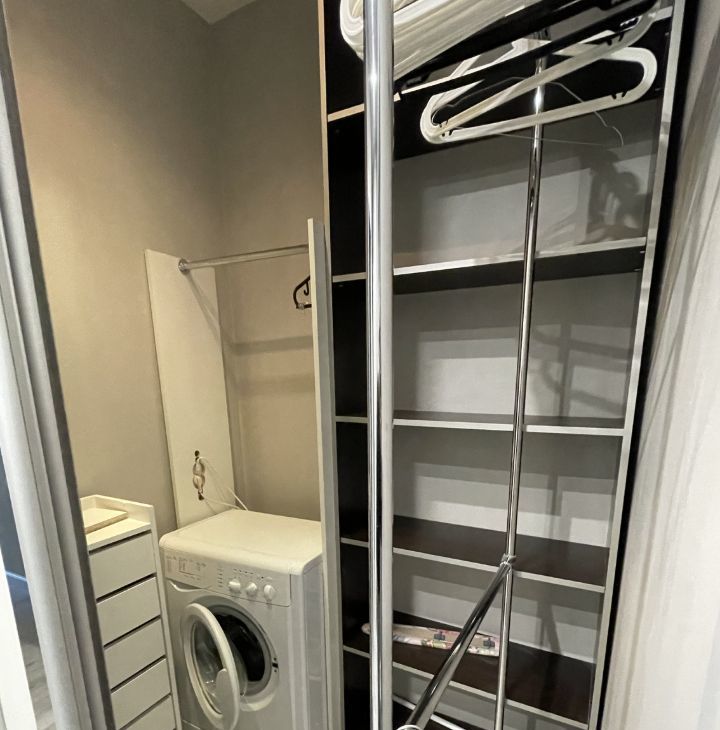 В квартире обустроена удобная гардеробная оборудованная стиральной машинкой.