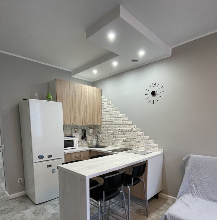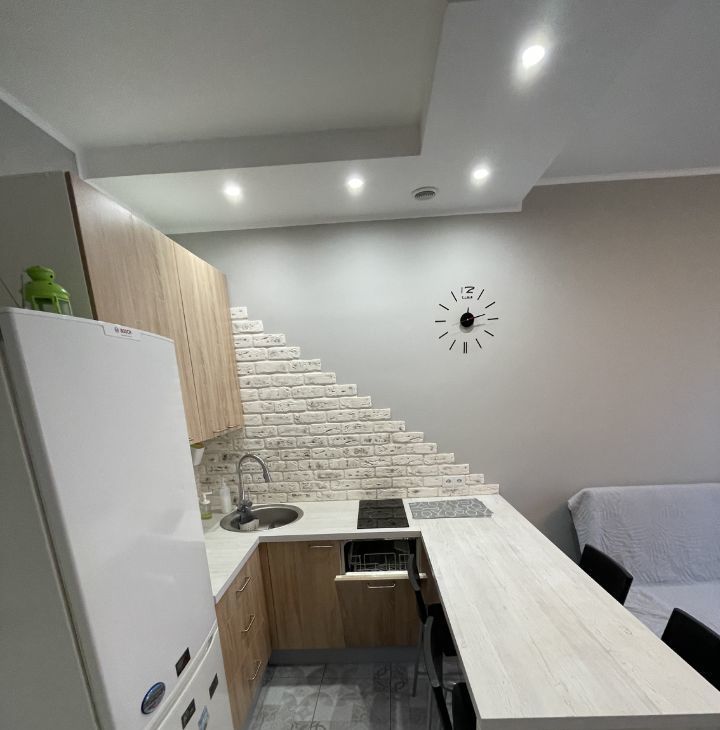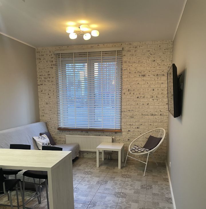 Квартира полностью готова для комфортного проживания со свежим ремонтом в стиле лофт.В комнате и на кухне есть необходимая мебель и спальные места. Из техники — холодильник, посудомоечная и стиральная машины, телевизор. В ванной комнате установлена современная душевая кабина. Окна выходят на улицу, что обеспечивает хорошую освещенность.