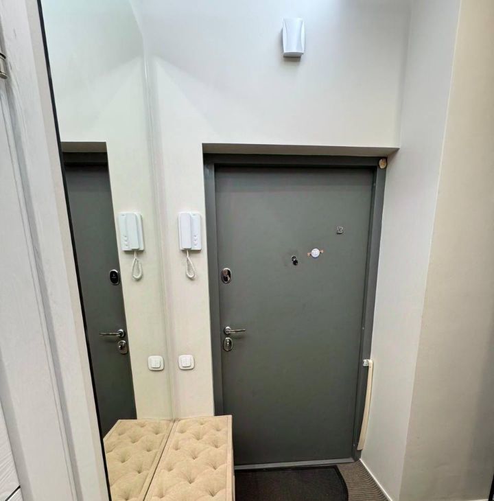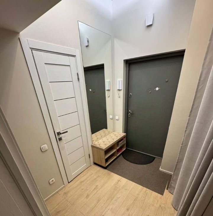 В прихожей большое зеркало во всю стену, стиральная машина и вместительная зона хранения вещей.