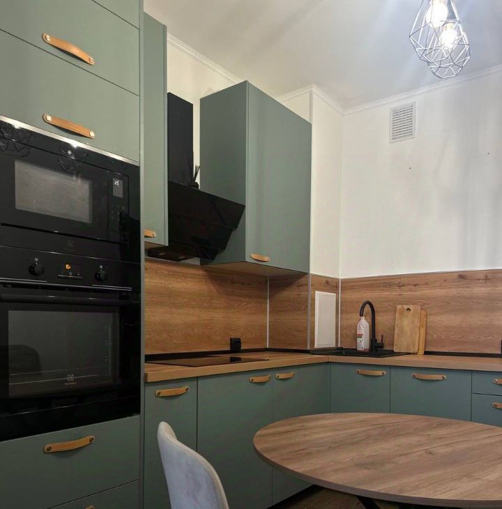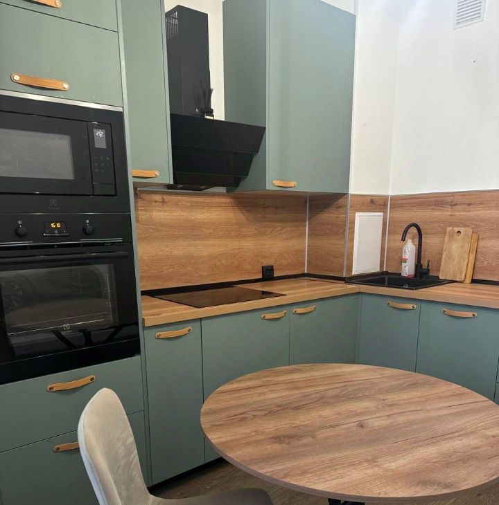 Просторная кухня укомплектована всей необходимой мебелью и техникой.