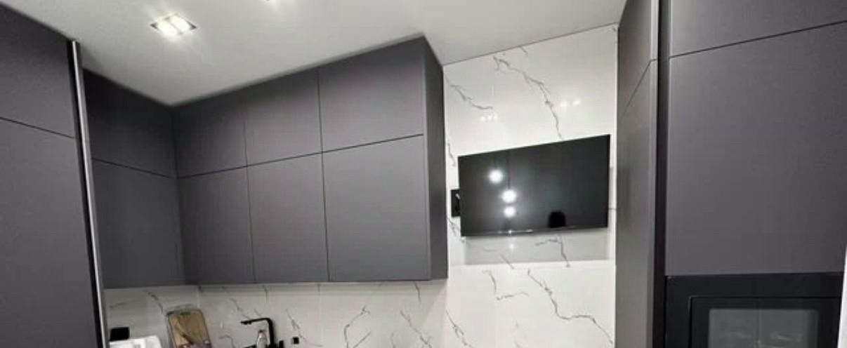 Просторная кухня 10 м² с техникой: плита, духовой шкаф, холодильник, ТВ