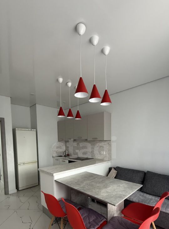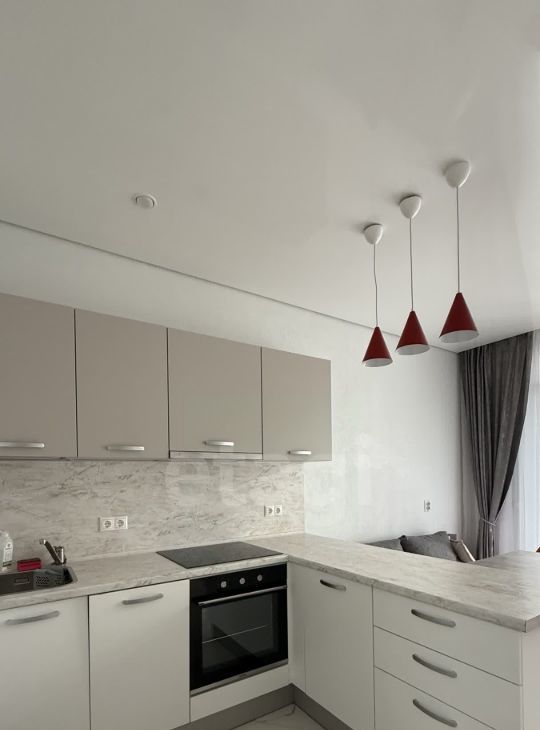 Кухня-гостиная укомплектована всей необходимой техникой: холодильник, посудомоечная машина, варочная панель, духовой шкаф и вытяжка, а также имеется раскладной диван и телевизор со SmartTV.