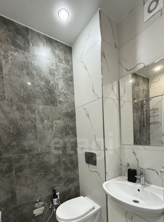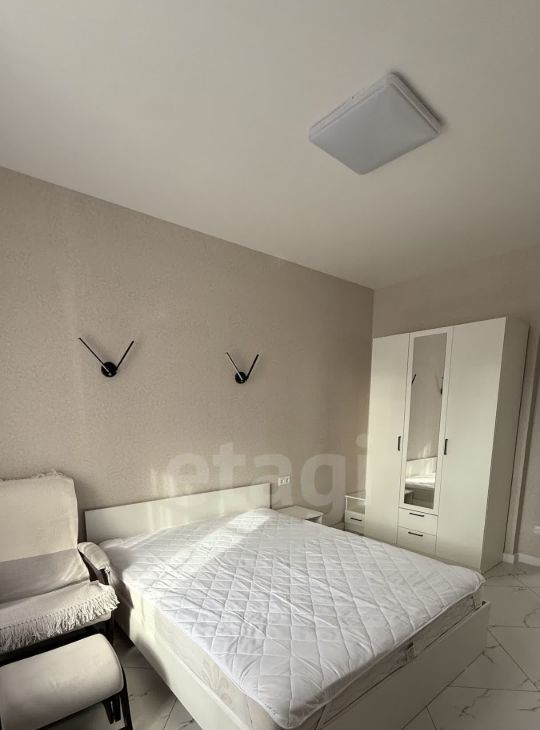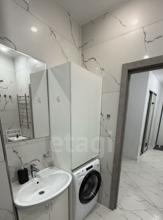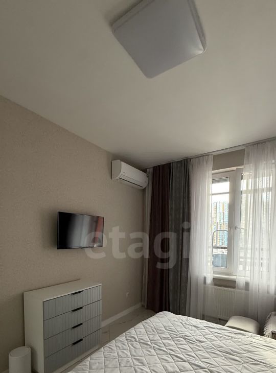 Спальная зона оборудована кроватью размером 160x200 см, вместительным шкафом, комодом и дополнительным телевизором. В совмещенном санузле размещена стиральная машина, ванна и электрический полотенцесушитель