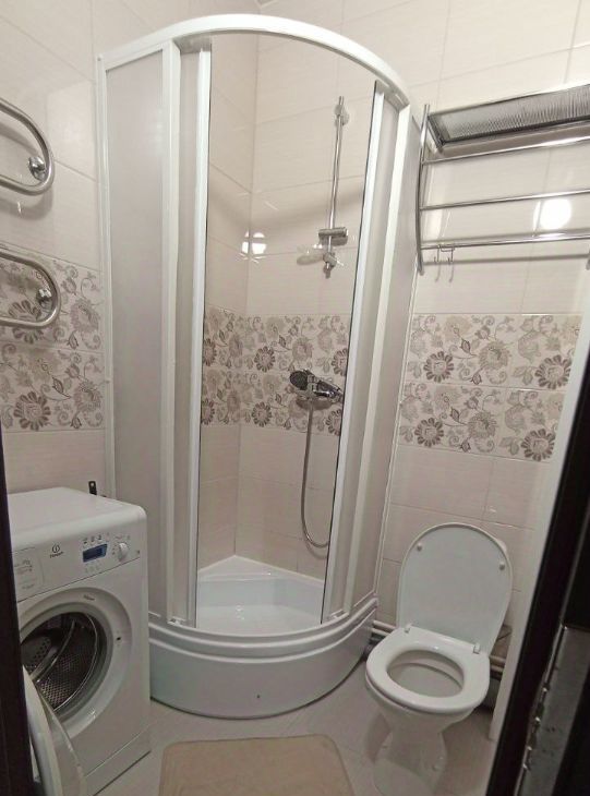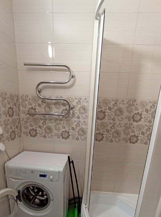 В ванной комнате установлена душевая кабина и стиральная машина.