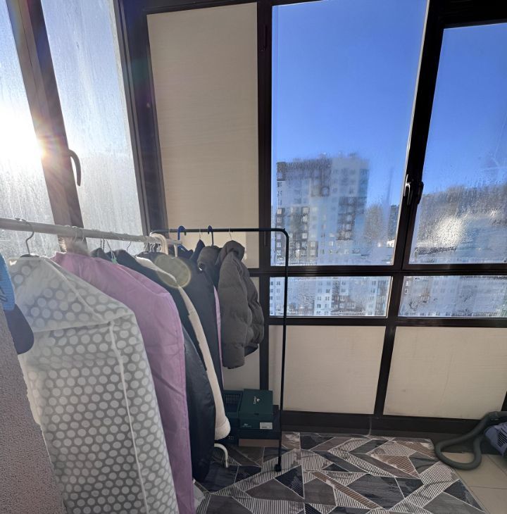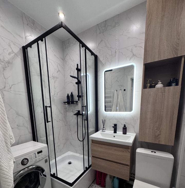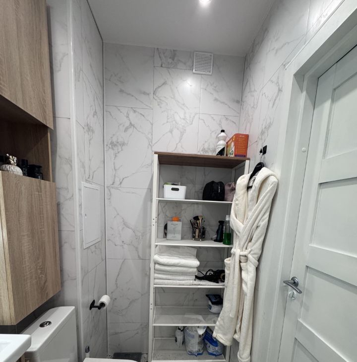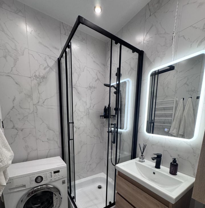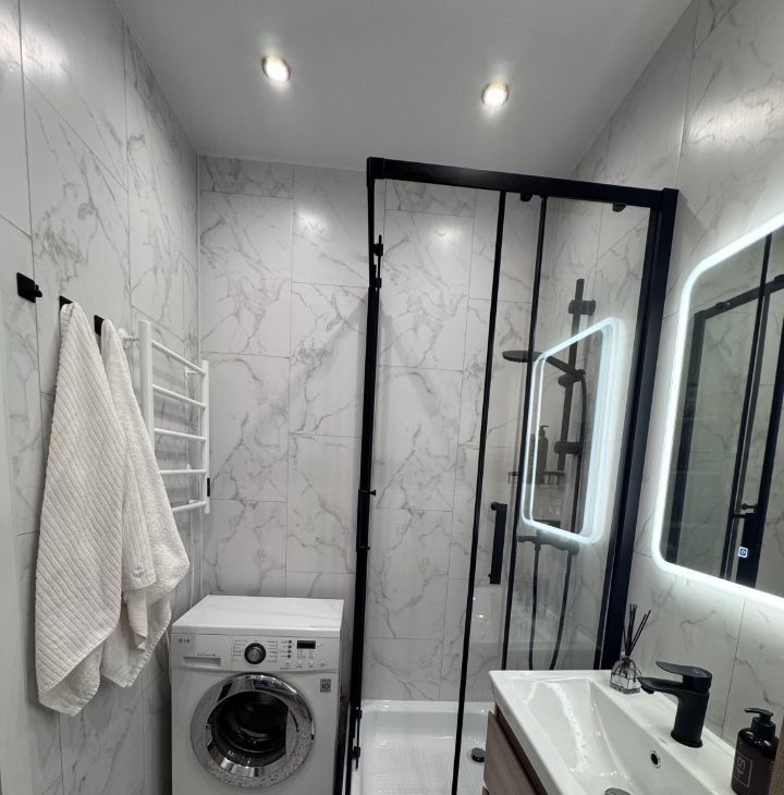 В квартире есть совмещенный санузел с душевой кабиной, стиральной машинкой. Также имеется лоджия, где можно обустроить зону отдыха или мини-оранжерею, очень вместительная.