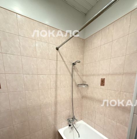 Ванная комната с ванной и душем, кафельные стены, сантехника в хорошем состоянии.
