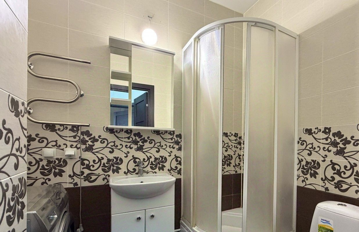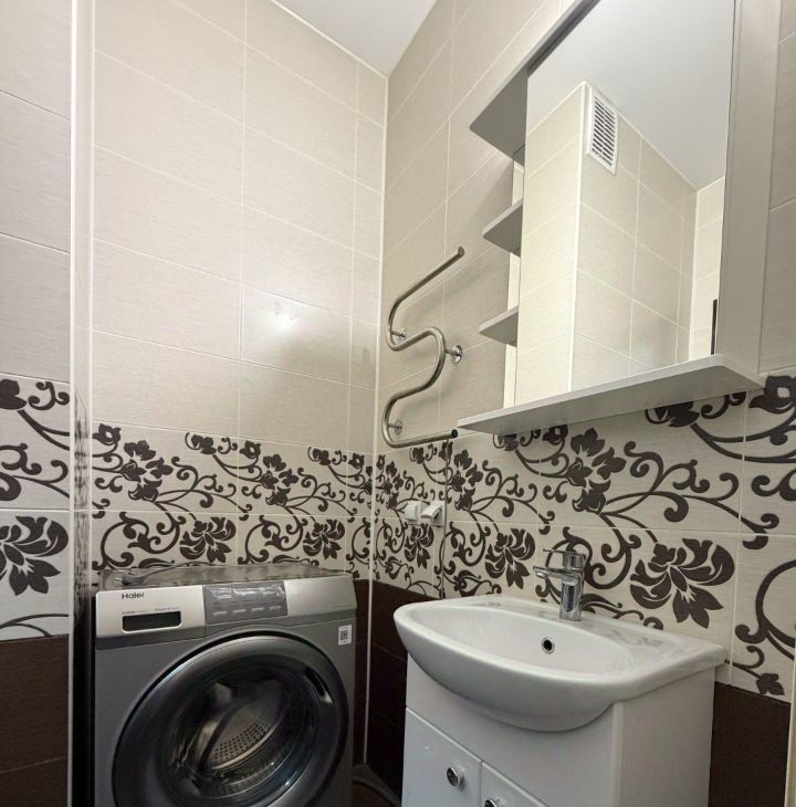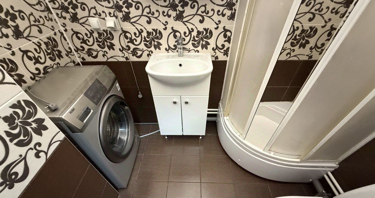 Сан\узел совмещенный: душевая кабина, стиральная машина, тумба с раковиной, зеркало.