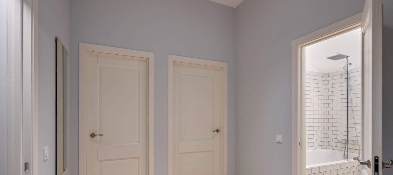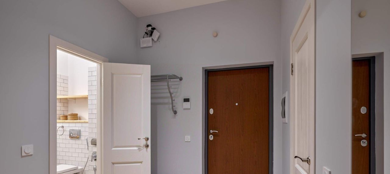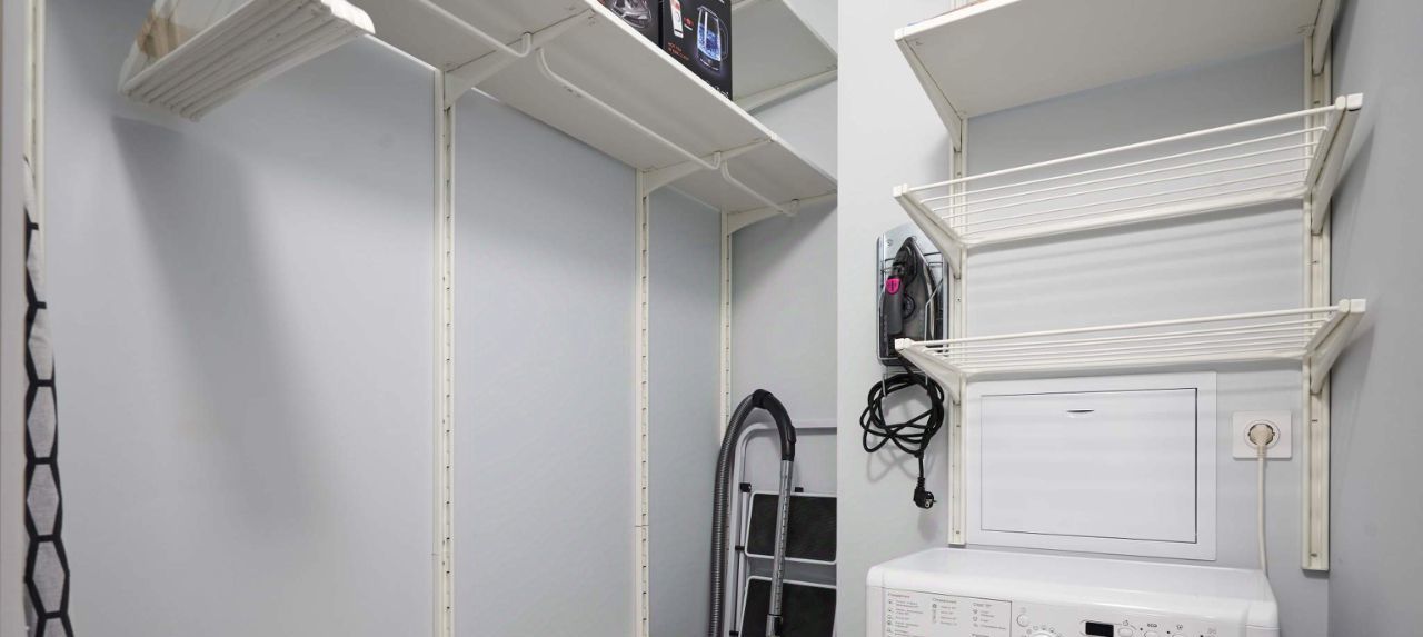 В большой спальне, помимо двуспальной кровати, оборудована рабочая зона. В ванной комнате установлены теплые полы. В каждом помещении предусмотрены объемные зоны хранения, а сразу у входа - прекрасно продуманная гардеробная.