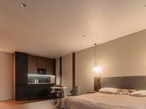 Планировка: оборудованная всей необходмой современной техникой кухня с обеденной зоной и выходом на лоджию, большая спальня с выделенной гостиной зоной, раздельная ванная комната.