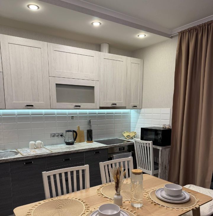 Есть вся необходимая мебель и техника, посуда и хозяйственные принадлежности, достаточное количество мест хранения, удобное зонирование в кухне гостиной и спальне.