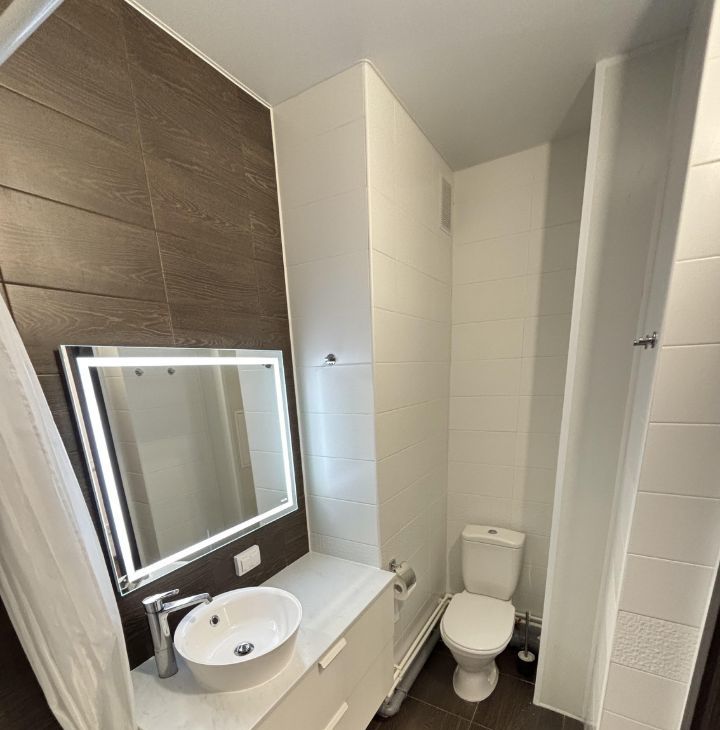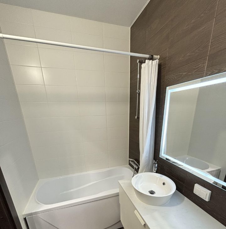 Удобный совмещенный санузел с ванной и зеркалом с подсветкой. Удобная автоматическая система снятия показаний со счётчиков.