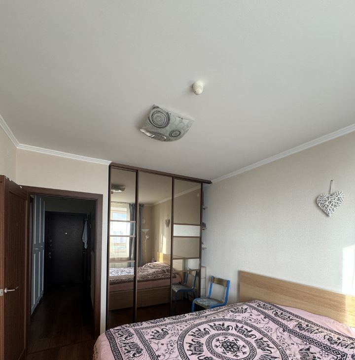 В спальне встроенный шкаф-купе для одежды, большая кровать.
