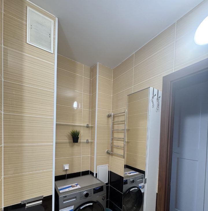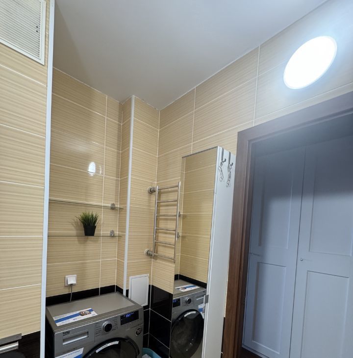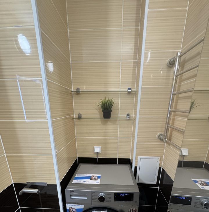 В ванной импортная сантехника и мебель. Стиральная машинка Beko.