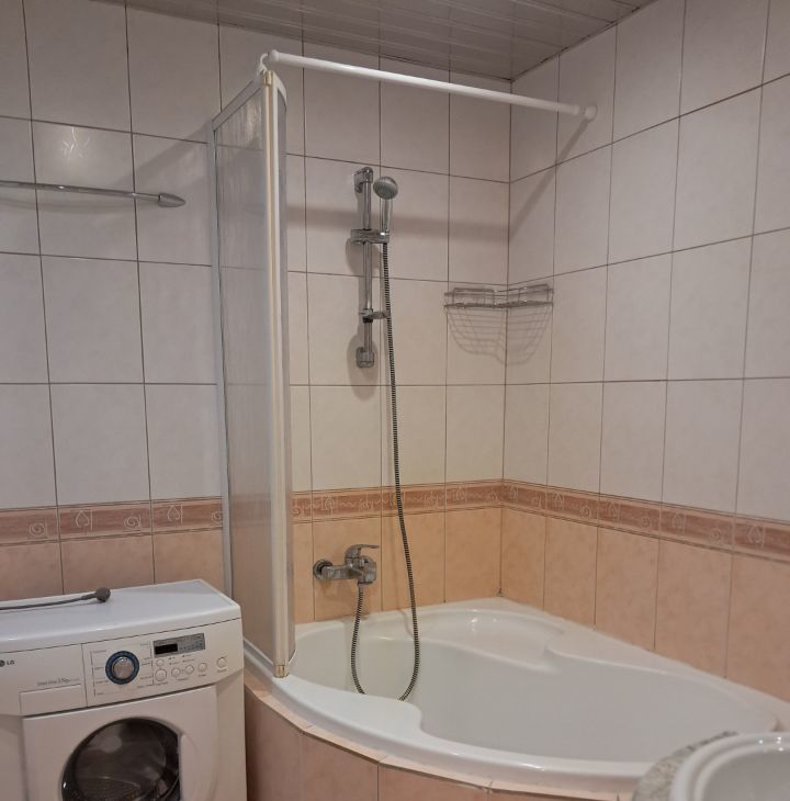 Квартира укомплектована всем необходимым для длительного проживания: 2 спальных места (раскладывающийся диван), полностью кухонная мебель и техника (микроволновая печь, холодильник, посудомоечная машина, плита с духовым шкафом, маленький телевизор).