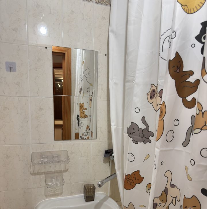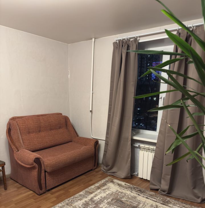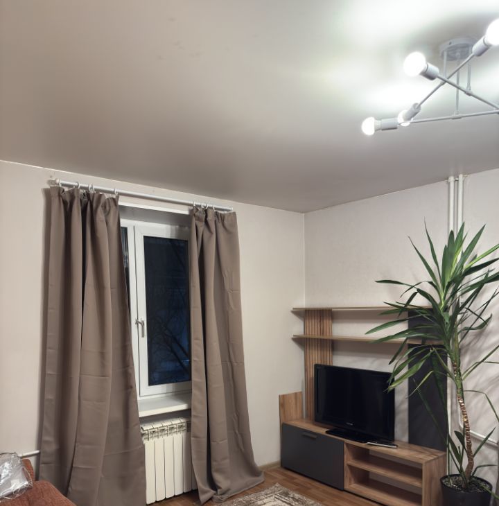 В квартире выполнен косметический ремонт, что создает приятную атмосферу. Просторная комната оборудована шкафами и диваном, а также имеется телевизор. Кухня площадью 8 м² оснащена холодильником, плитой и стиральной машиной. Санузел совмещенный, оформлен в светлых тонах.
