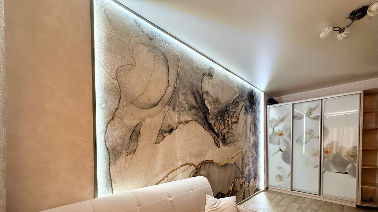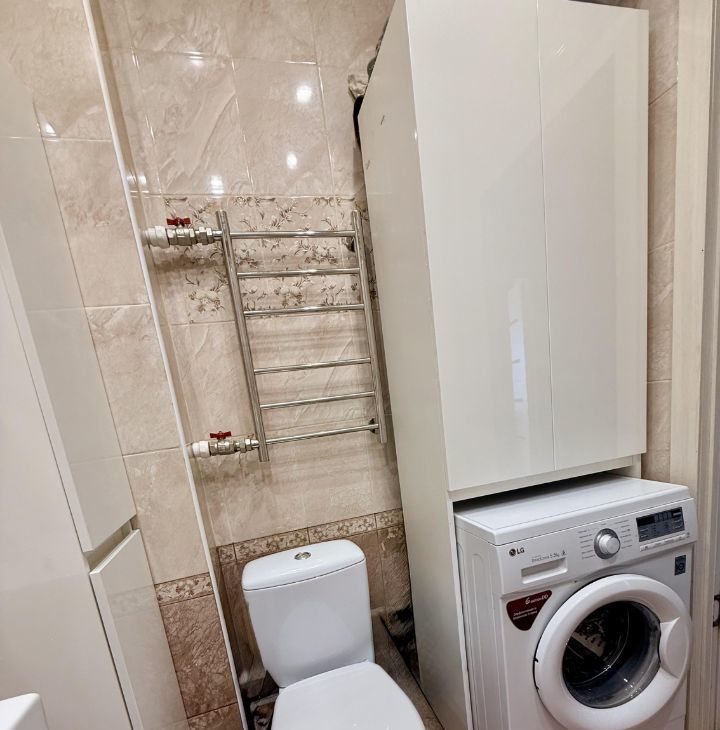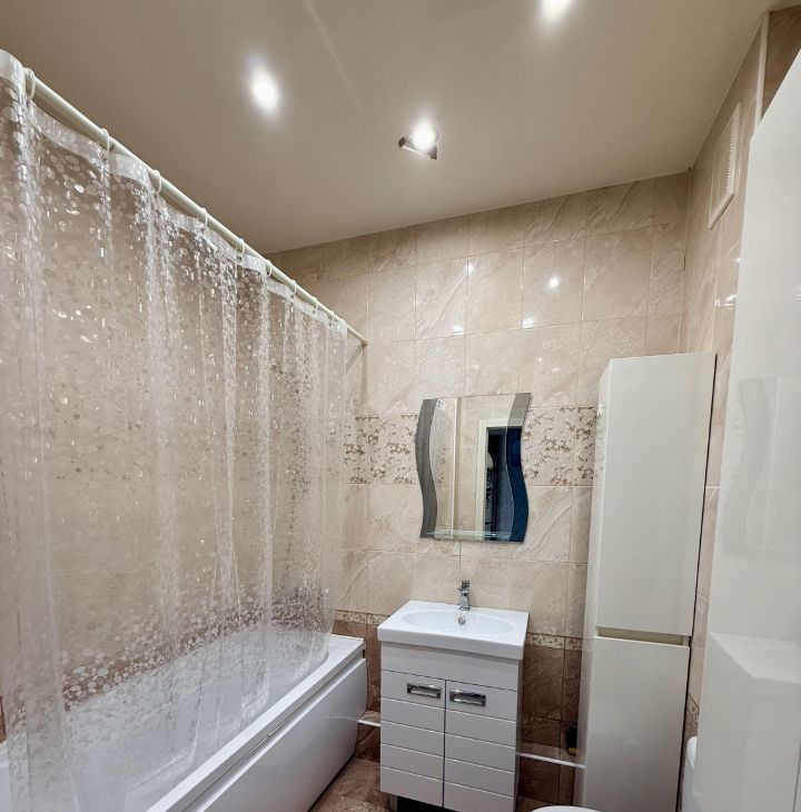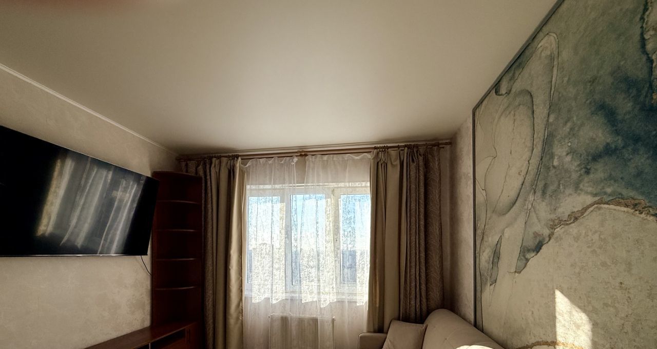 Сделан свежий дизайнерский ремонт. Качественная сантехника. Натяжной потолок во всех комнатах. Просторная лоджия. Из мебели остается: кухонный гарнитур, новая электрическая плита, обеденный стол, стулья, новый раскладной диван, большой шкаф для одежды, тумба ТВ со шкафами, стиральная машина, большая ванная.