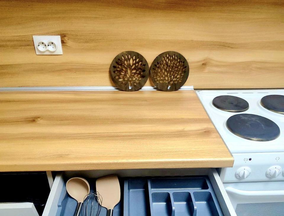 Просторная, со вкусом обставленная, одиннадцатиметровая кухня с новым кухонным гарнитуром и необходимой бытовой техникой, включающей в себя холодильник (Beko, 300 л), посудомоечную машину Weisgauff (55х45 см), микроволновую печь и чайник, и кухонной утварью на первое время.