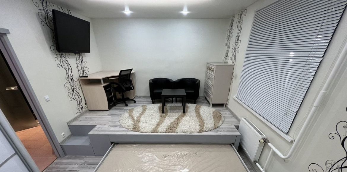Благодаря подиуму с выдвижной двуспальной кроватью в комнате остается много свободного пространства.