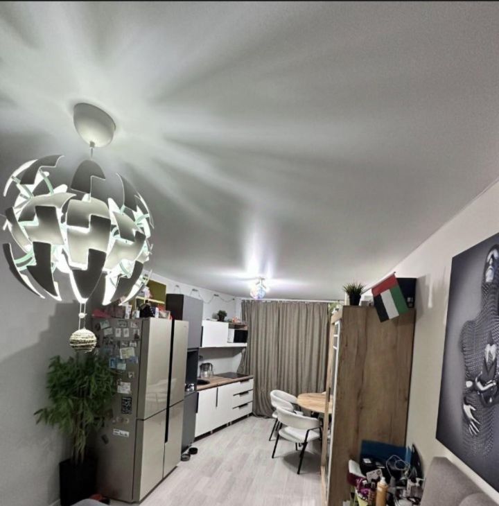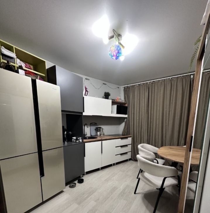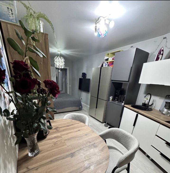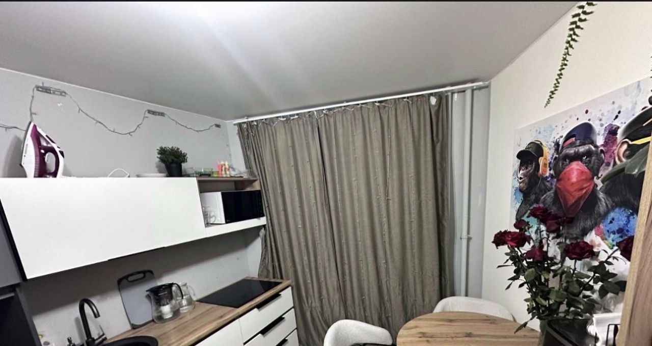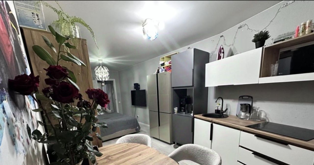 Общая площадь составляет 42,3 кв. м., из них жилая — 20 кв. м., а кухня — 11 кв. м. На данный момент квартира обустроена как евродвушка -без капитальных вложений и перепланировок (большая комната-студия с кухней и еще одна спальня).