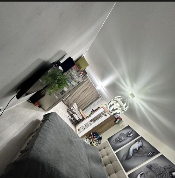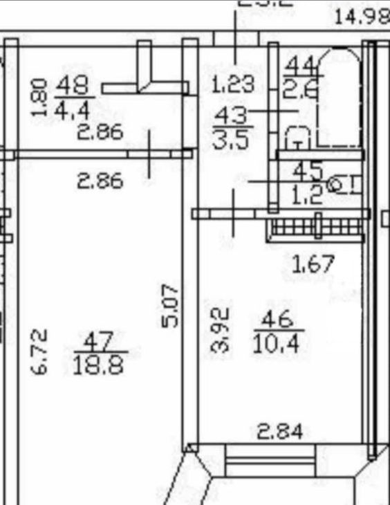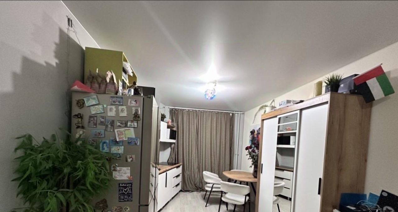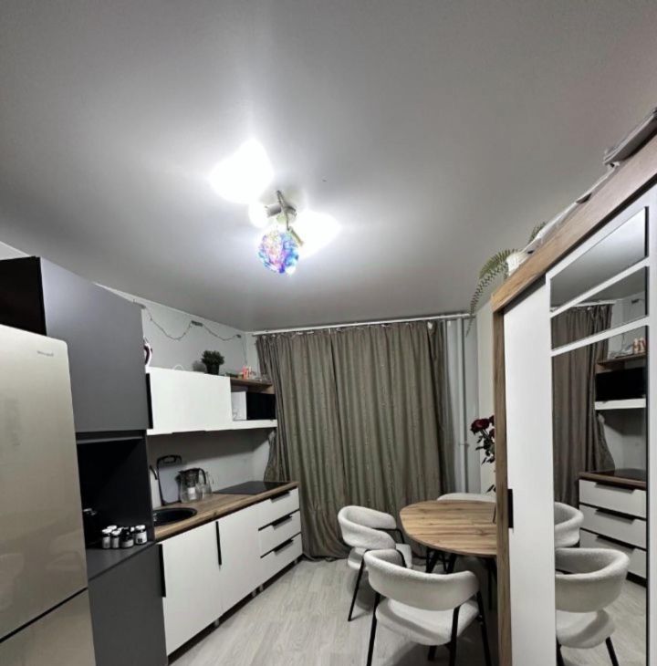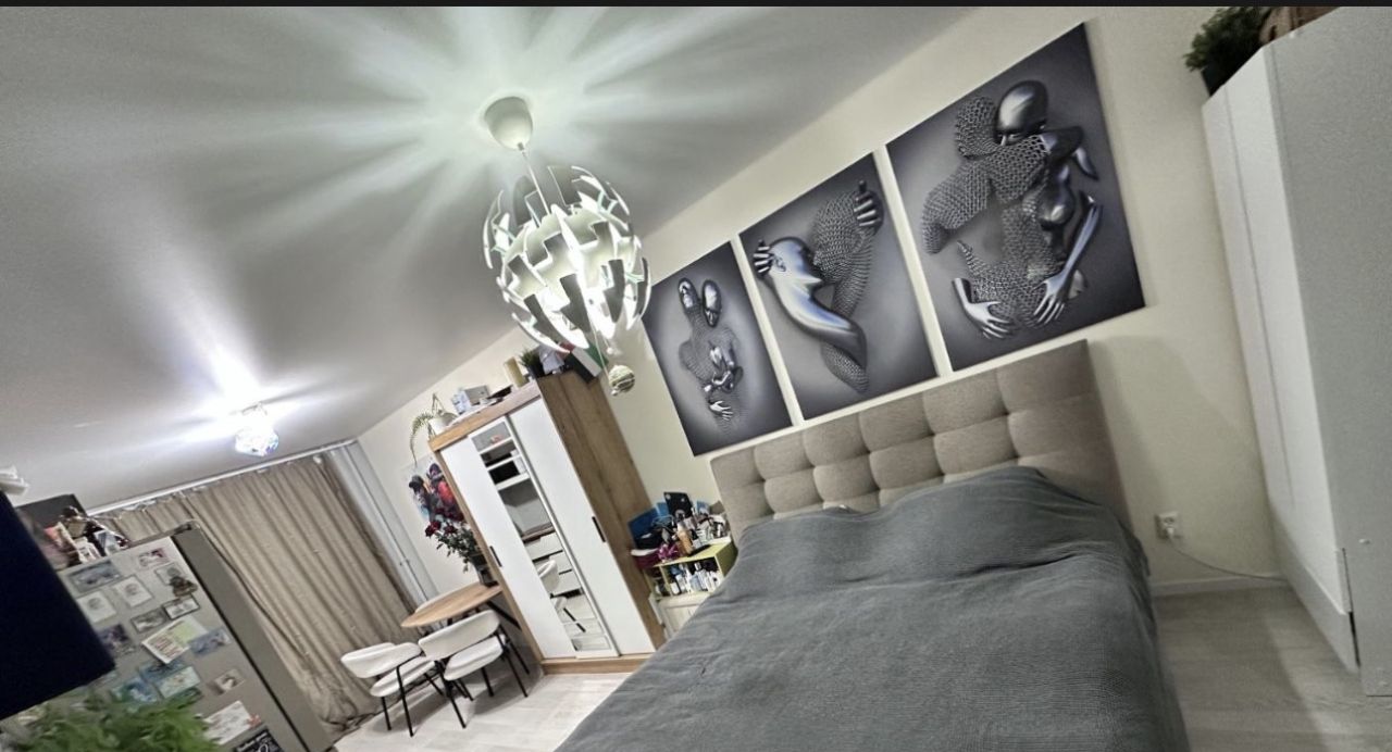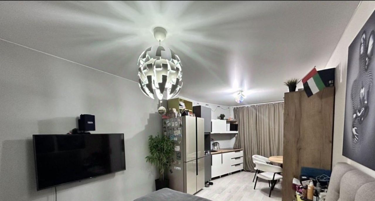 Общая площадь составляет 42,3 кв. м., из них жилая — 20 кв. м., а кухня — 11 кв. м. На данный момент квартира обустроена как евродвушка -без капитальных вложений и перепланировок (большая комната-студия с кухней и еще одна спальня).