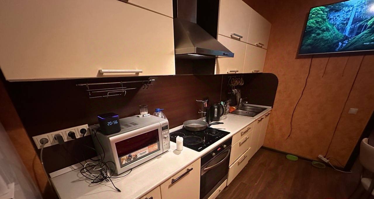 Просторная кухня полностью укомплектована мебелью и бытовой техникой, есть спальное место. Телевизоры на кухне и в основной комнате. Есть большая просторная комната с выходом на застекленную лоджию.