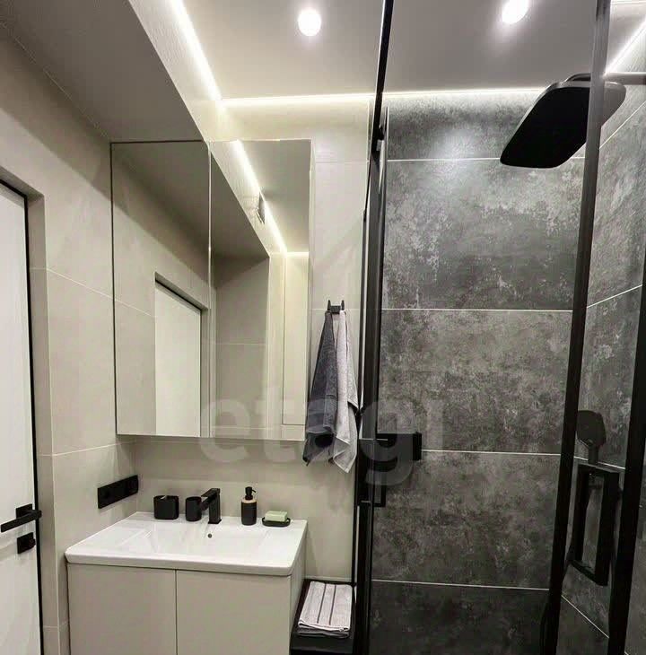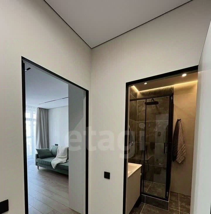 Санузел оборудован душевой кабиной, гигиеническим душем, теплой стеной и теплым полом. В спальне организовано рабочее и спальное место: диван-кровать (150*196 см) и раскладной диван (140*200 см) в кухне-гостиной. Достаточное количество мест для хранения обеспечивают большой шкаф в прихожей, шкаф в спальне, комод и тумба.