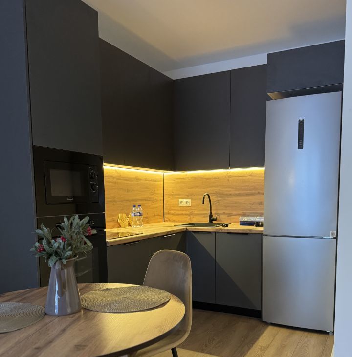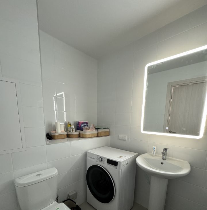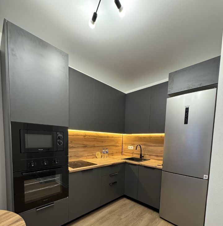 Полностью укомплектована техникой и мебелью: варочная панель, встроенные духовой шкаф и СВЧ, холодильник, посудомоечная и стиральная машины, телевизор.
