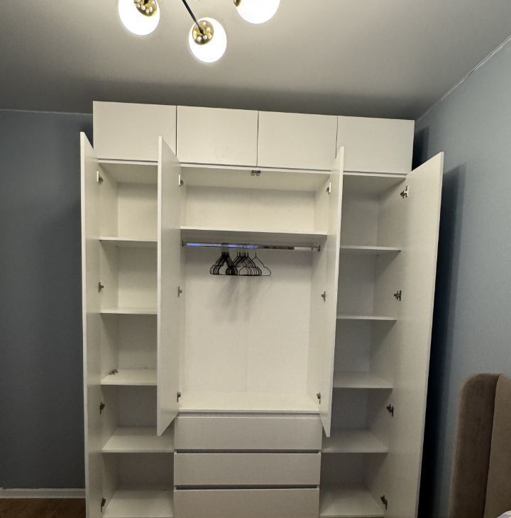 В спальне вместительный шкаф, вешалки, 2 комплекта постельного белья.