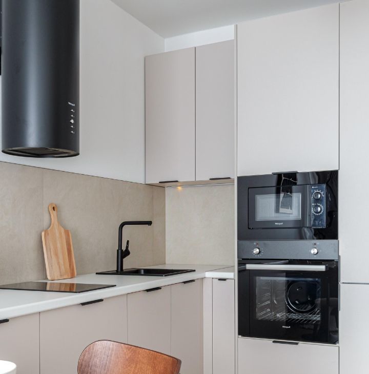 Встроенная кухня: посудомоечная машина, холодильник, духовой шкаф, варочная панель, микроволновка.