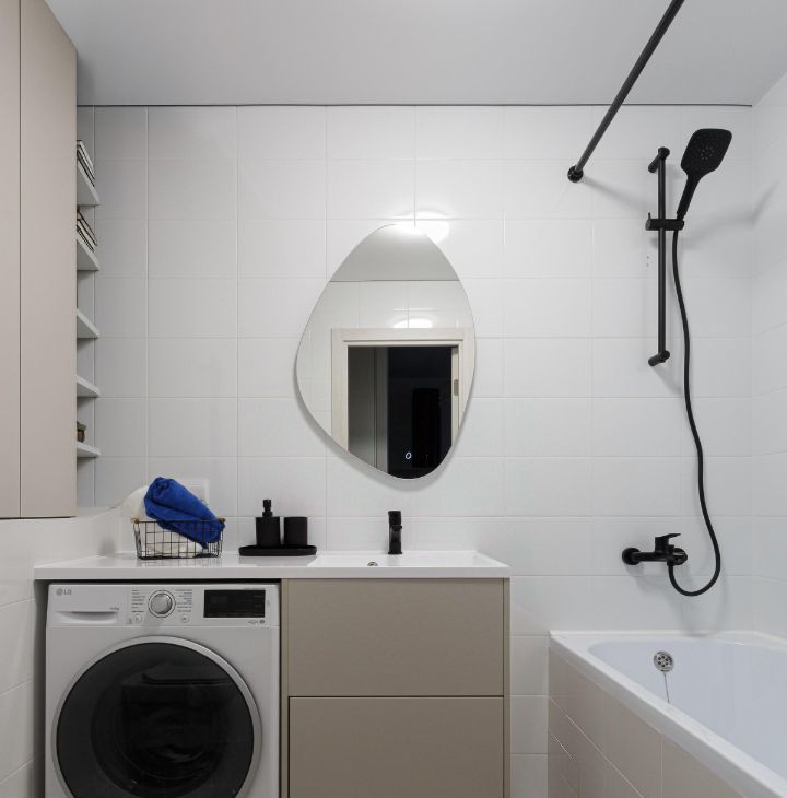 Санузел с ванной: стиральная машина с сушкой LG, полотенцесушитель