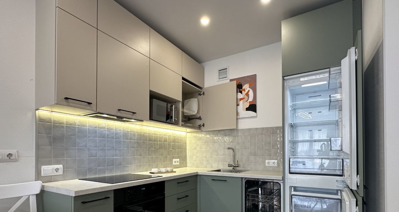 бытовая техника: электрическая плита, духовой шкаф, микроволновая печь, встроенный холодильник, посудомоечная машина, стиральная машина (всё новое);