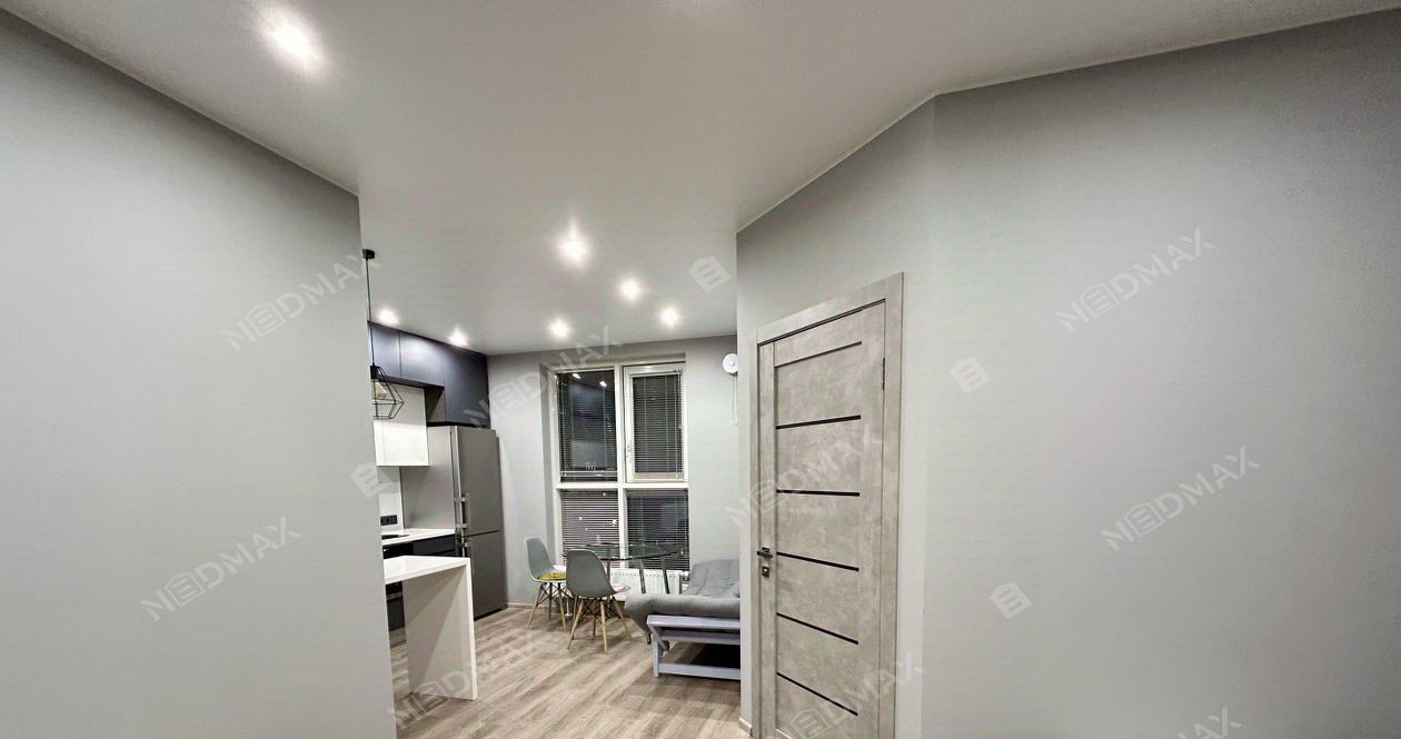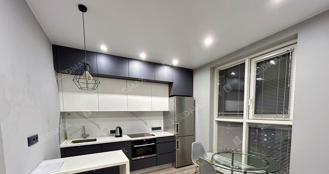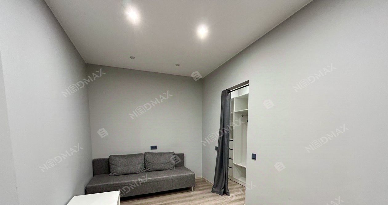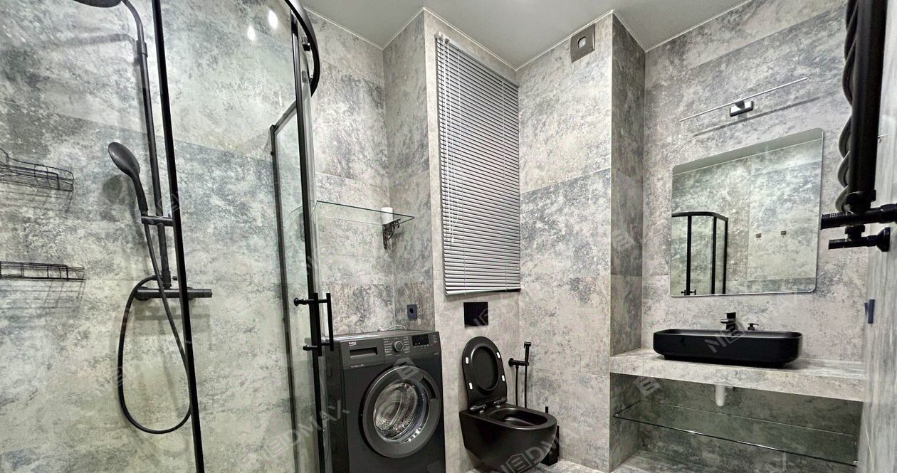 Квартира открытой планировки с зонированием. Просторная спальня с панорамным окном во двор, шторы блэк-аут. Встроенная кухня из натуральных материалов со всей необходимой техникой: варочная панель, вытяжка, холодильник, духовая печь и посудомоечная машина. Гостиная с раскладным диваном (получается спальное место) и кофейным столиком. Гардеробная отдельное помещение с большим количеством мест для хранения.