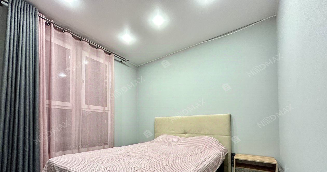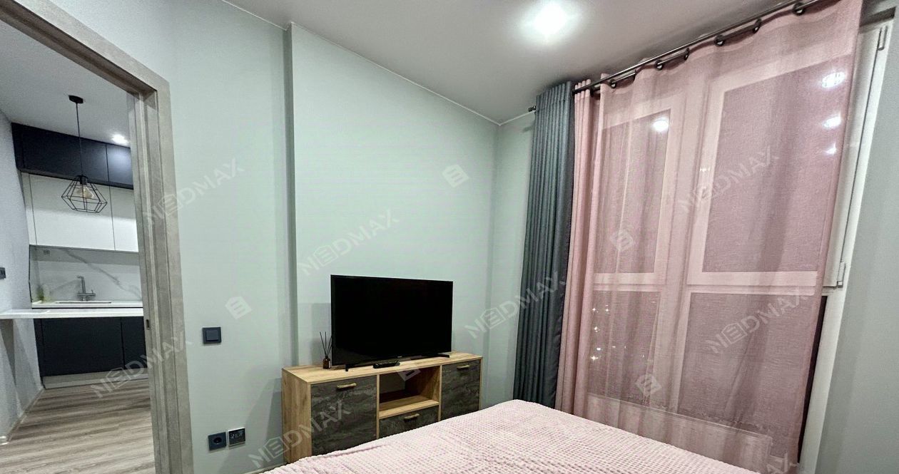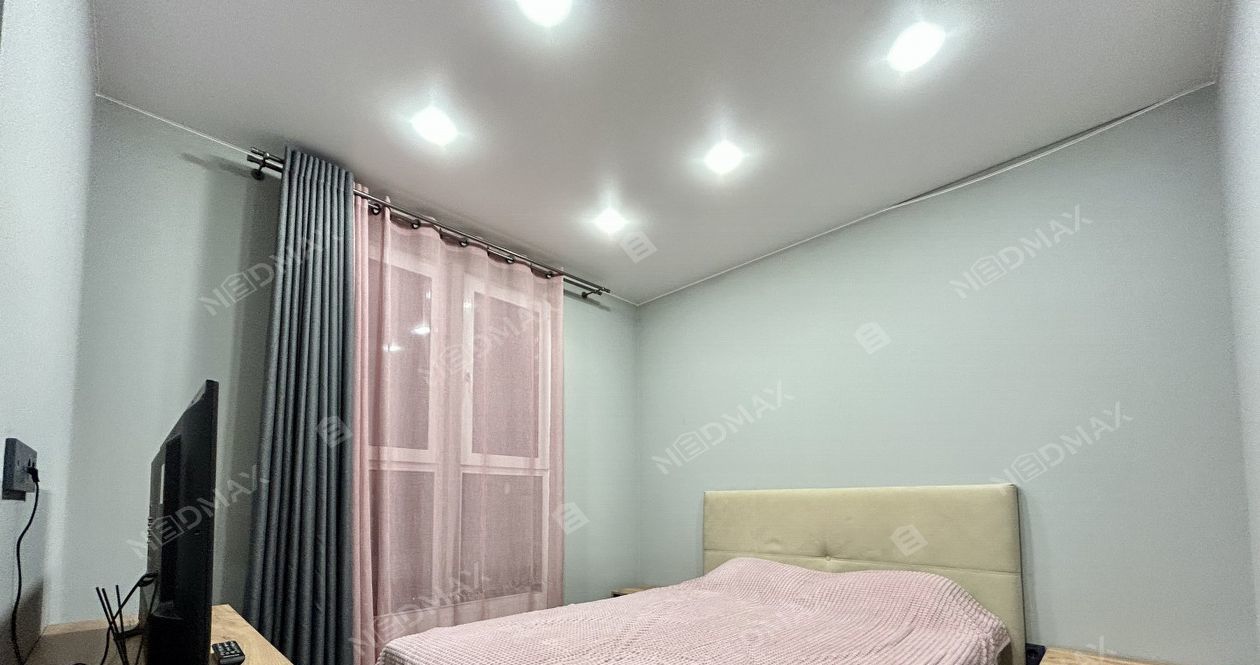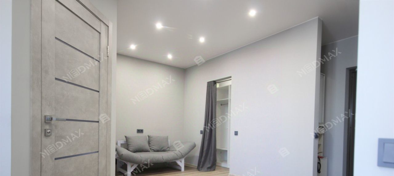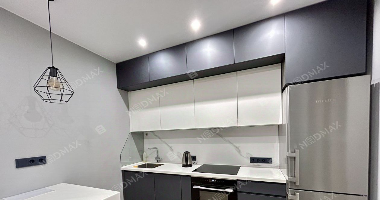 Квартира открытой планировки с зонированием. Просторная спальня с панорамным окном во двор, шторы блэк-аут. Встроенная кухня из натуральных материалов со всей необходимой техникой: варочная панель, вытяжка, холодильник, духовая печь и посудомоечная машина. Гостиная с раскладным диваном (получается спальное место) и кофейным столиком. Гардеробная отдельное помещение с большим количеством мест для хранения.