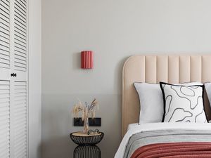 Комната разделена на две зоны, двуспальная кровать с металлическим изголовьем, прикроватые тумбы и ТВ в центре и межкомнатными поворотными балками отделена зона гардероба со столиком для макияжа.