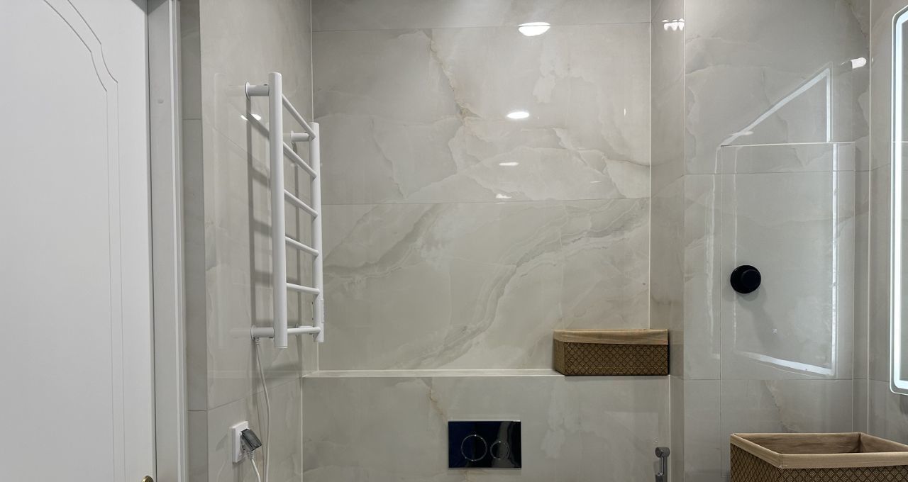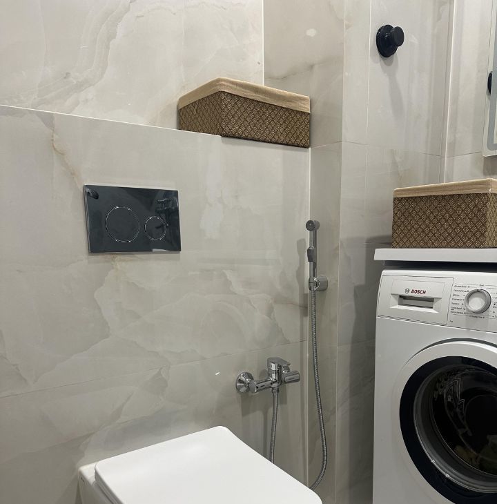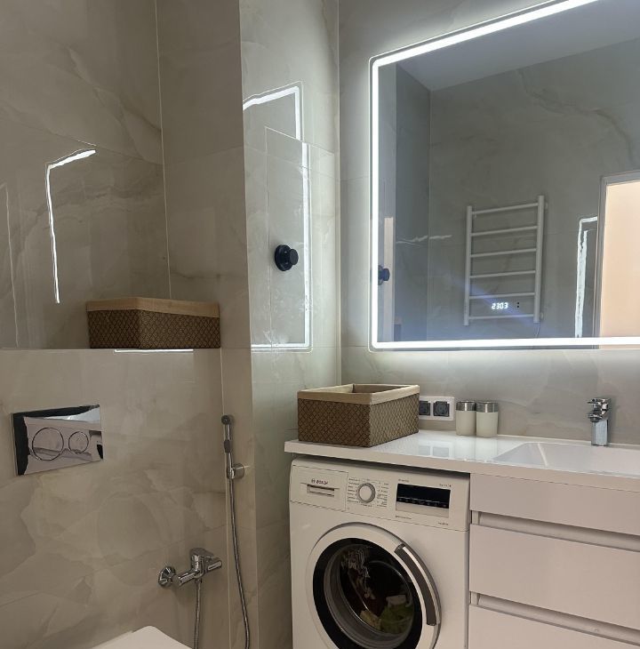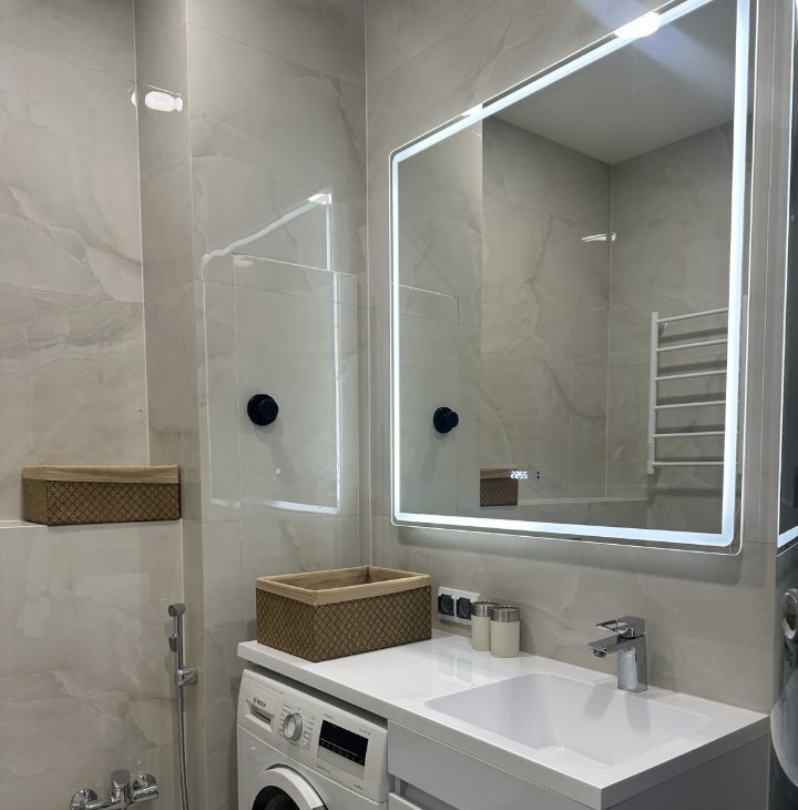 Для вашего комфорта квартира оборудована всей необходимой мебелью и техникой. Зеркало в ванной с подсветкой и часами , включается через сенсорное управление , также есть функция "антипар". В ванной установлен гигиенический душ и полотенцесушитель