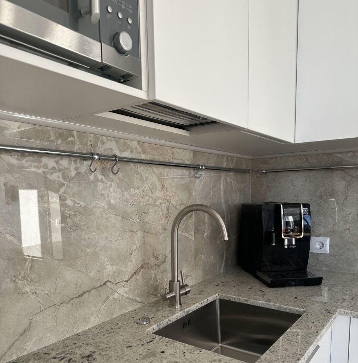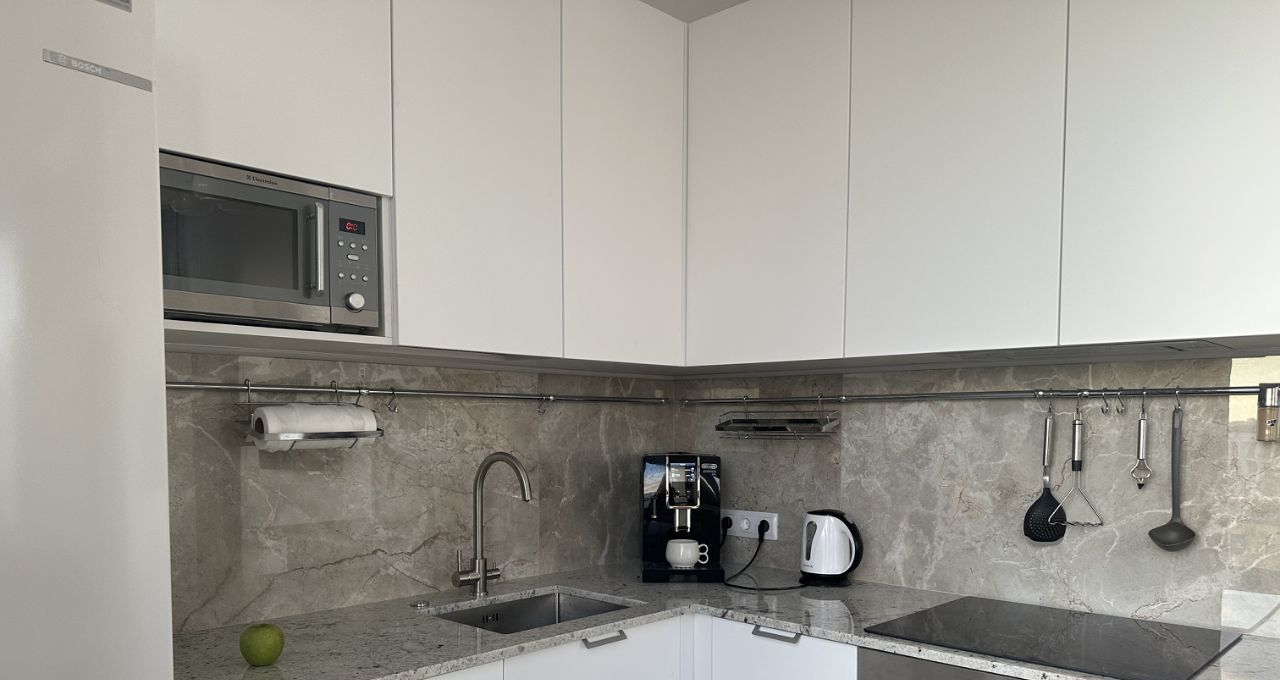 Кухня продумана до мелочей : столешница из натурального камня , плавное открывание дверей фасада, встроенная техника Bosch : холодильник, стиральная машина, посудомойка, духовка; Микроволновая печь Electrolux , кофемашина DeLonghi, есть чайник, а также, сенсорная вытяжка, установлен измельчитель и фильтры для воды. Для максимального комфорта, привезены из Финляндии : посуда Pentik, натуральное , теплое одеяло и подушки.