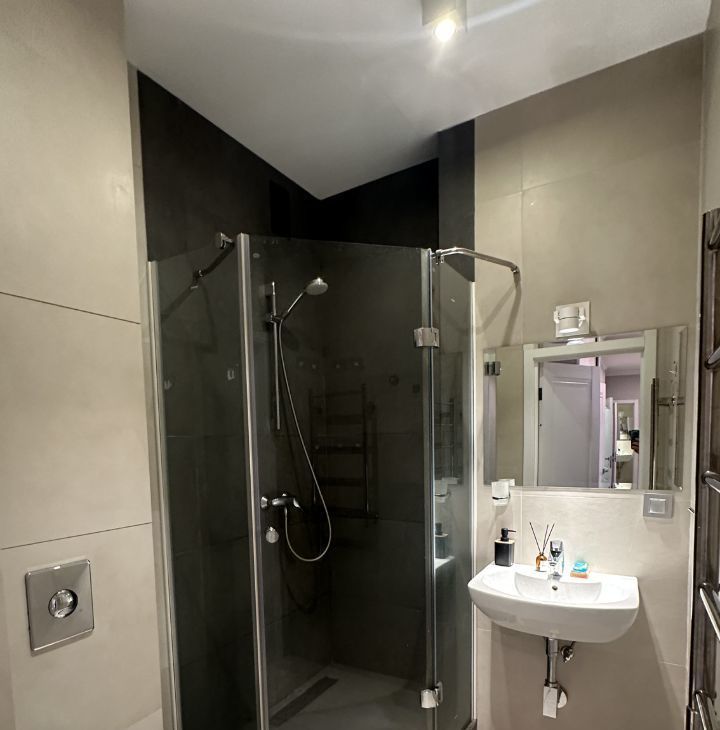 Сдается современная однокомнатная квартира в доме у парка. Площадь 38,8 метра, с балконом. При входе гардеробная. В санузле только душевая кабина, ванны нет. В кухне имеются холодильник, стиральная и посудомоечная машины, духовка (отдельностоящая, по желанию), микроволновая печь, роутер, два телевизора. В комнате двуспальная кровать. В кухне есть диван, при желании раскладывающийся в спальное место.