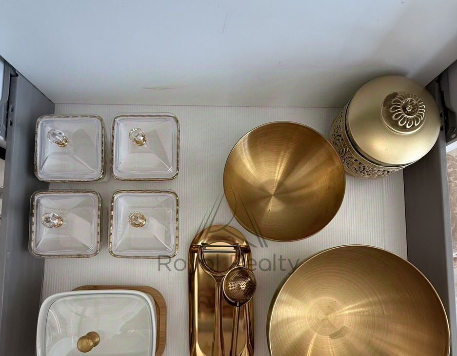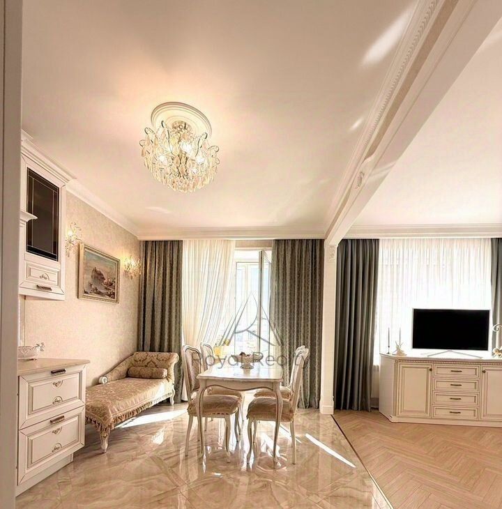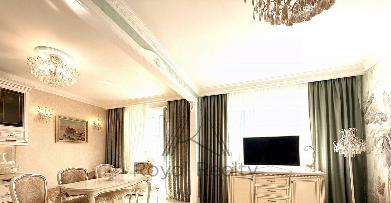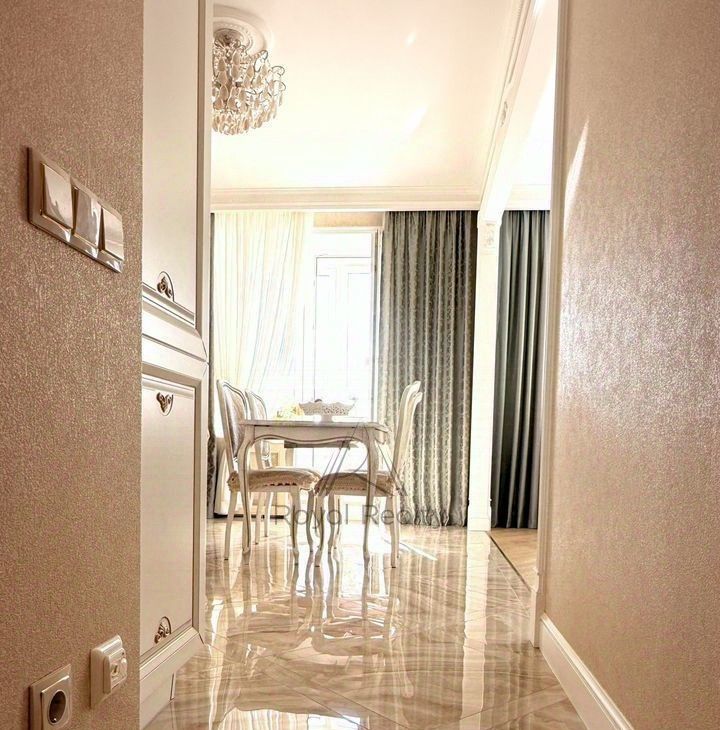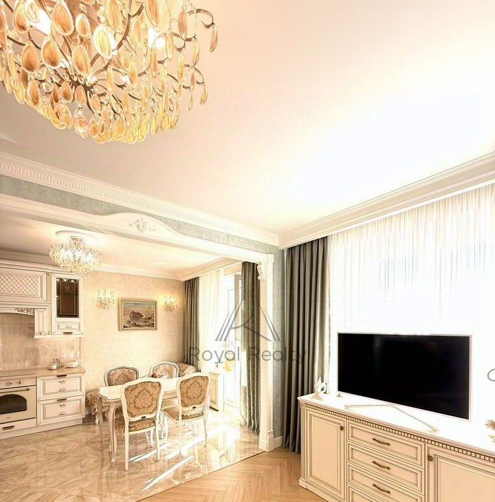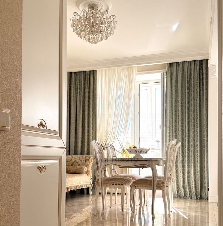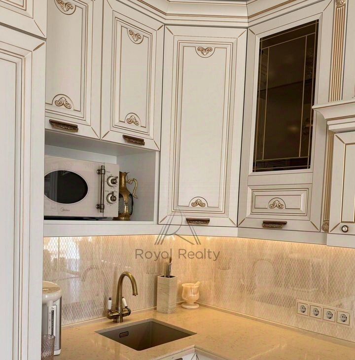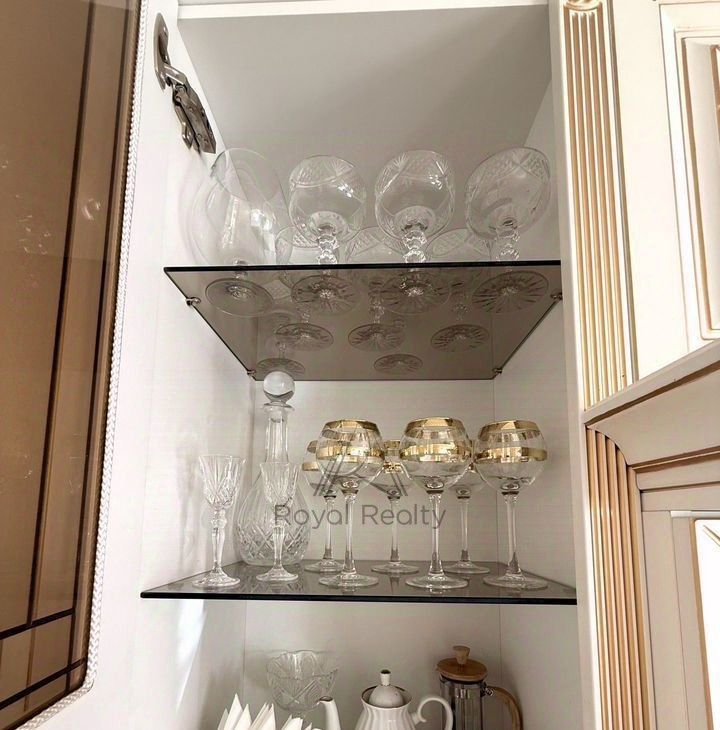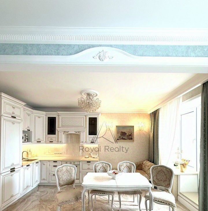 Придаёт торжественное настроение белая кухонная мебель с золотой патиной, со столешницей из камня. Кухня укомплектована встраиваемой техникой: посудомоечная машина, духовой шкаф, варочная поверхность, вытяжной шкаф, холодильник. В наличии бытовая техника: электропотер, микроволновая печь, в достаточном количестве кухонная, столовая посуда, установлены фильтры для очистки воды. Глянцевый пол с эффектом оникса придаёт дополнительный шарм. Нотку романтизма в гостиной добавляет кушетка рекамье.