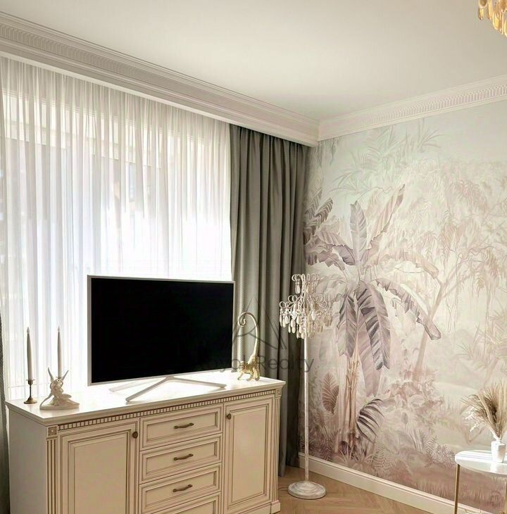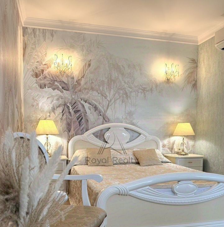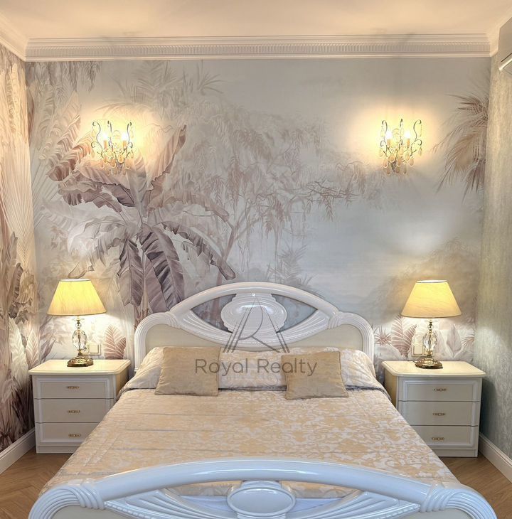 На прикроватных тумбочках изящные настольные лампы с абажуром для индивидуального освещения, что позволит с комфортом читать перед сном. В комнате имеется вместительный белый комод в стиле "Наполеон", телевизор smаrt tv.