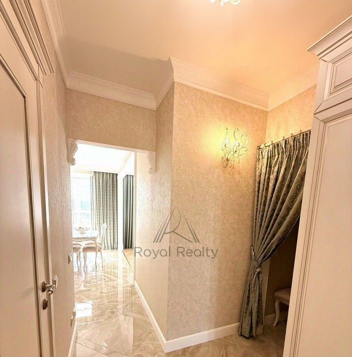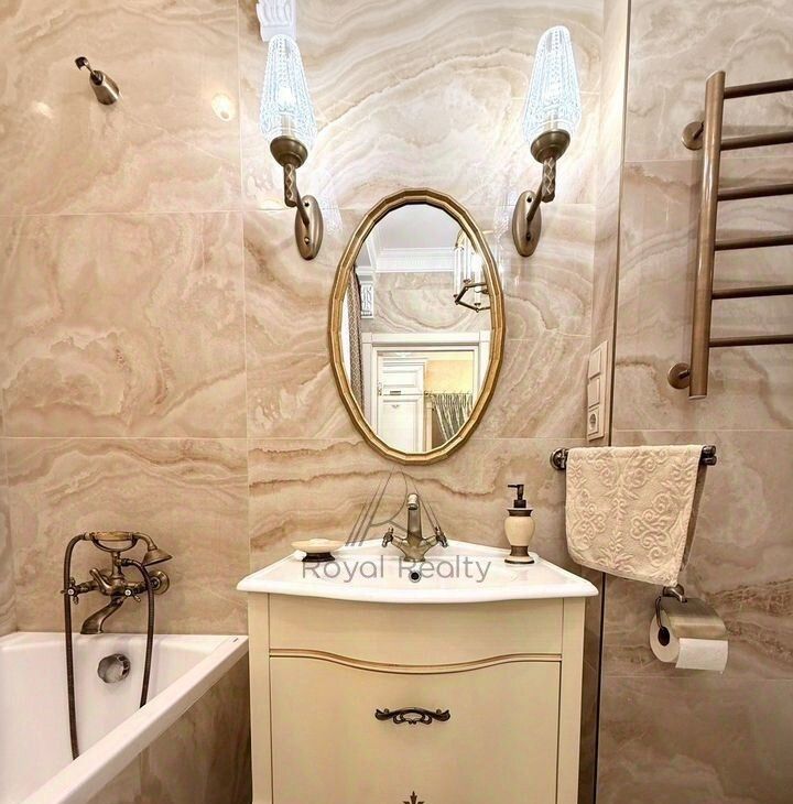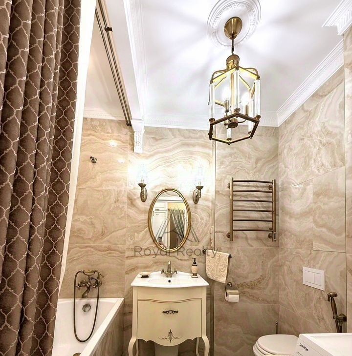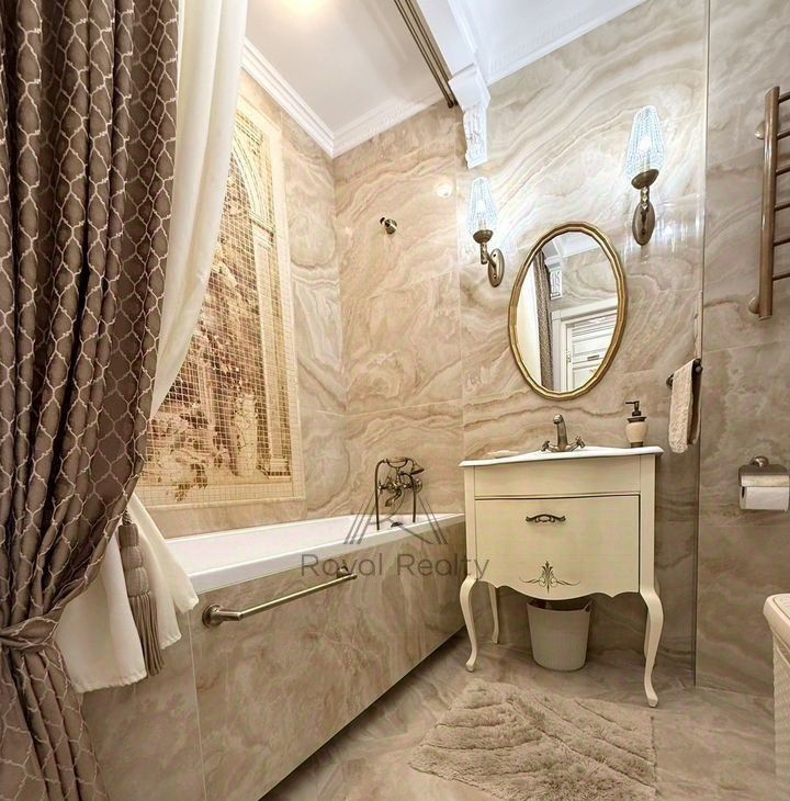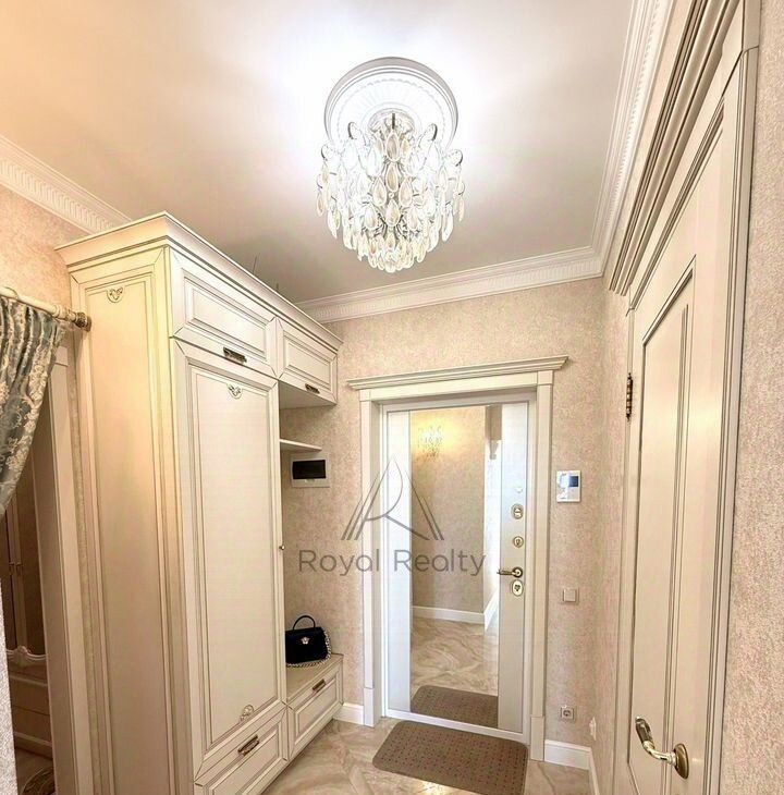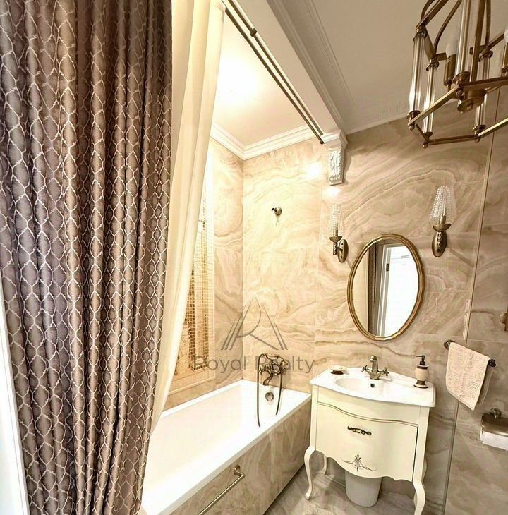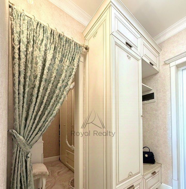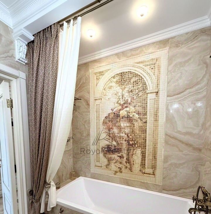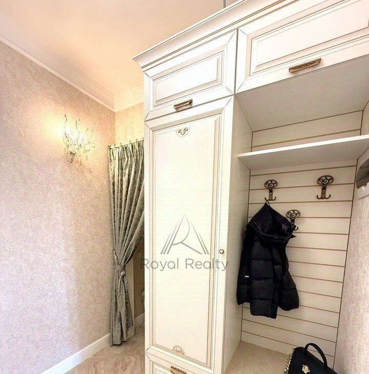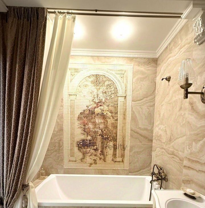 В квартире есть отдельная гардеробная комната с зеркальным шкафом для хранения вещей, а также со всем необходимым оборудованием для уборки и глажки белья. Изысканный интерьер совмещенной ванной комнаты украшает мозаичное панно.