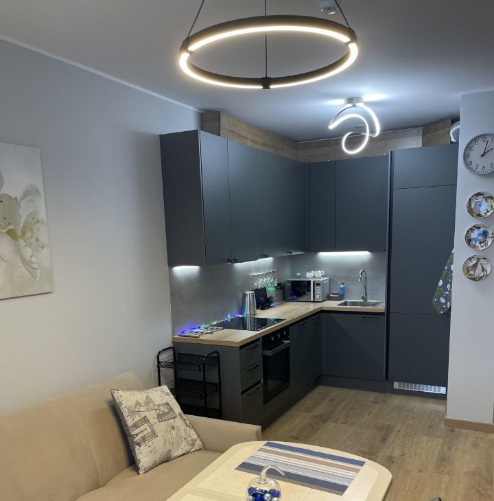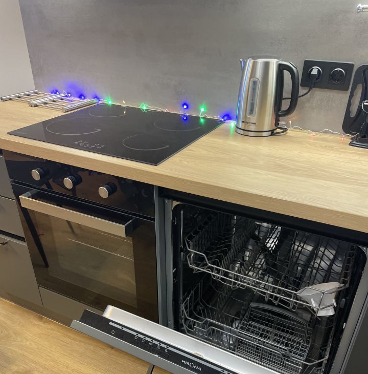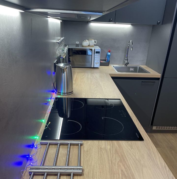 Для тех, кто ценит уют и комфорт, у нас есть все для того, чтобы Вам сразу заехать и жить Кухня полностью укомплектована: индукционная плита, духовой шкаф, посудомоечная машина, микроволновая печь, чайник, встроенный холодильник, вся необходимая посуда для приема пищи и готовки. В Кухне-гостиной диван аксона, раскладной с ортопедическим матрасом, чтобы Ваши гости спали в комфорте.