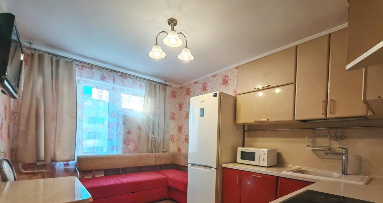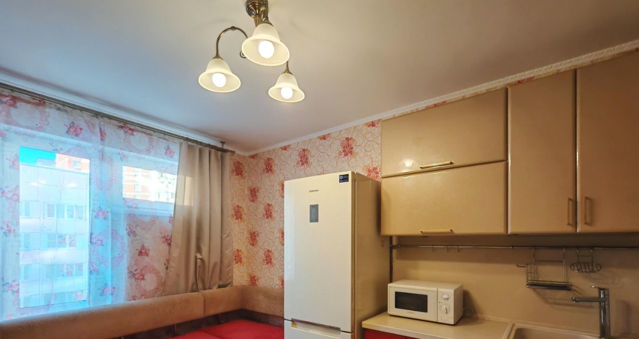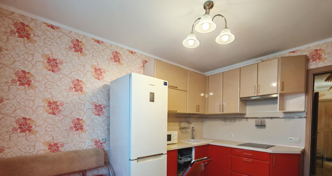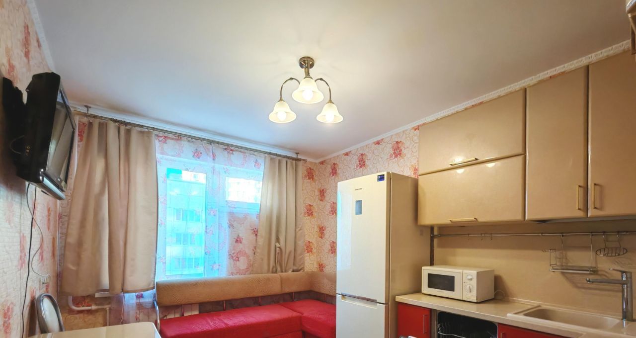 Кухня просторная — 10,8 м². Встроенная кухня, электрическая варочная поверхность, холодильник, посудомоечная машина. Есть обеденный стол со стульями и диван-тахта (раскладывается). На кухне также есть телевизор — можно и готовить, и отдыхать.