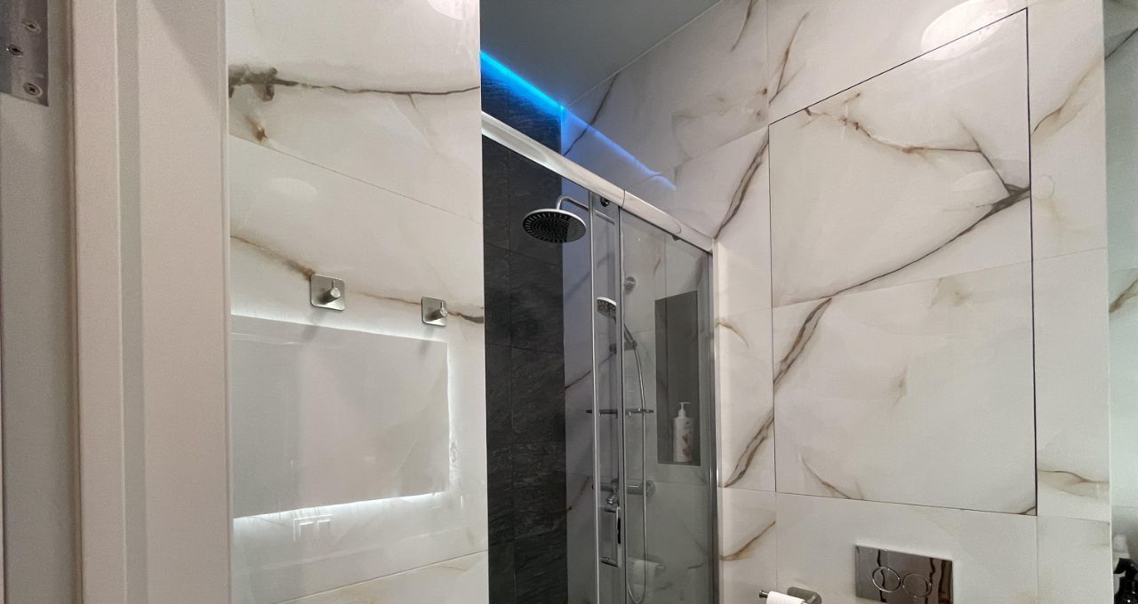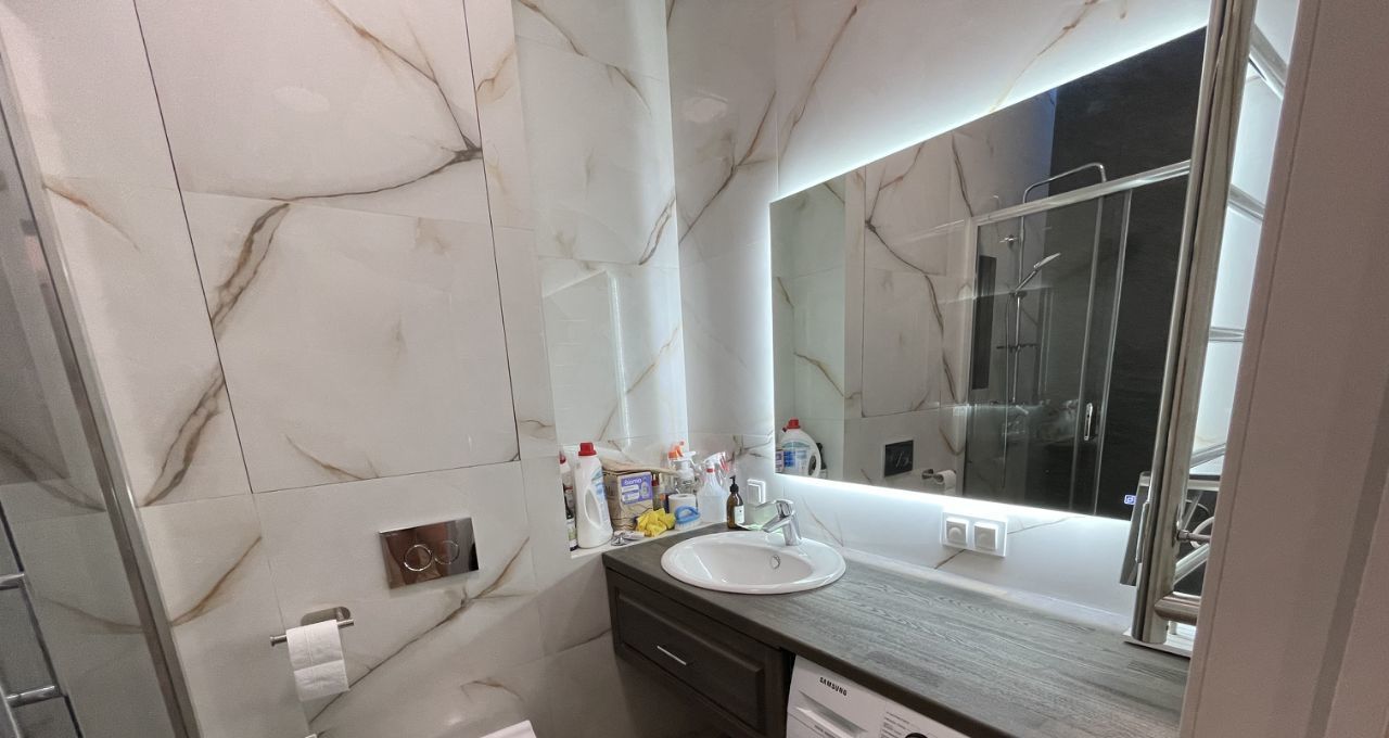 В санузле душ в нише, стиральная машина Самсунг, инсталляция и большое зеркало.