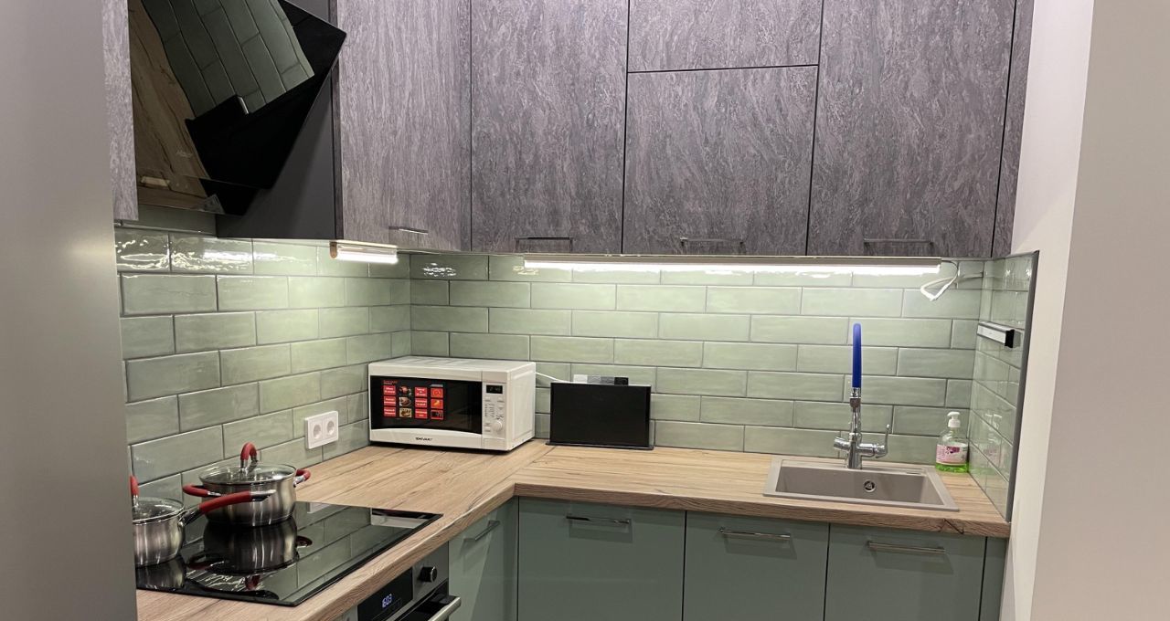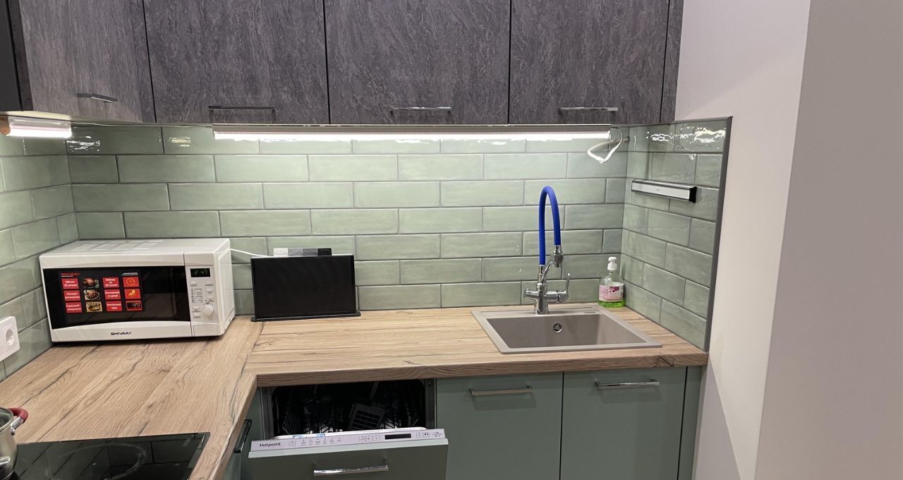 Кухня выполнена с доводчиками и оборудована плитой, микроволновкой, посудомойкой, фильтром для воды , чайником и всей необходимой посудой. Также имеется холодильник, диван раскладной (спальное место 120 см шириной) для гостей, стол и стулья.