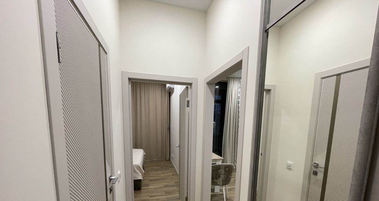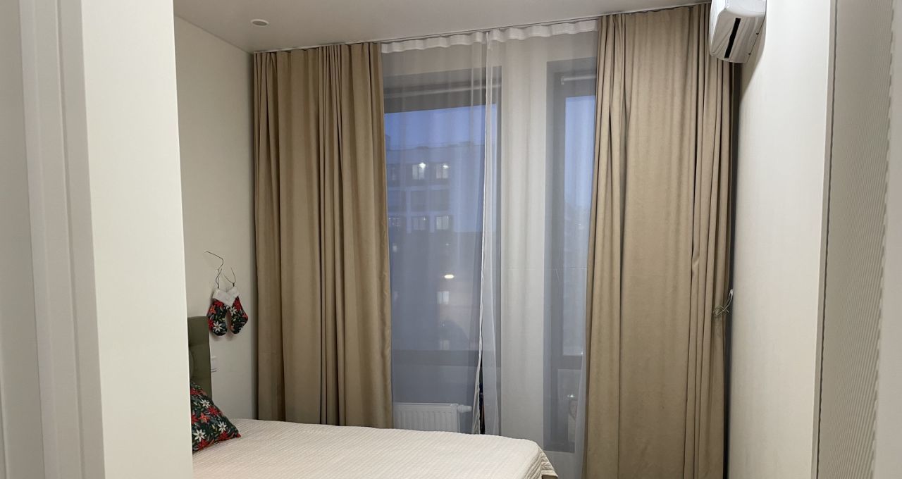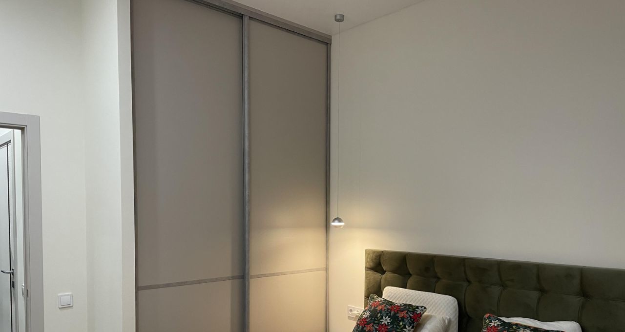 В спальне большая кровать шириной 180 см с подъемным механизмом для хранения вещей, ортопедический матрас Ormatek, шкаф-купе с доводчиками - внутри система хранения с корзинами и выдвижной брючницей, кондиционер, большие панорамные окна и шторы блэкаут.