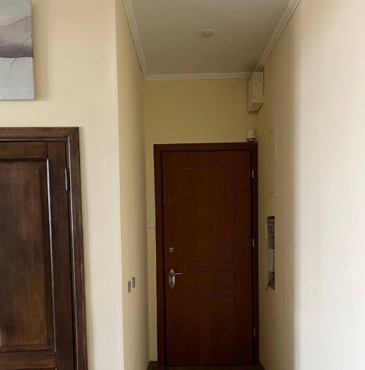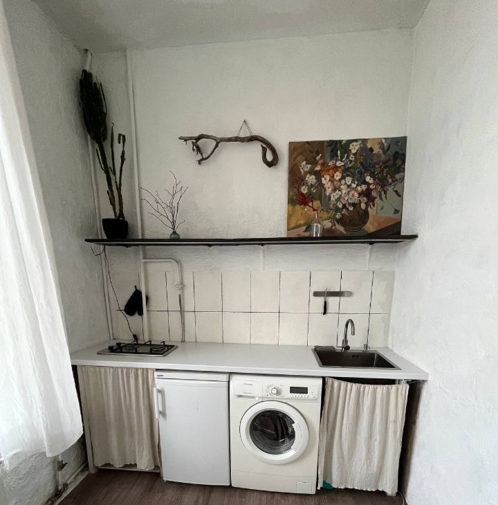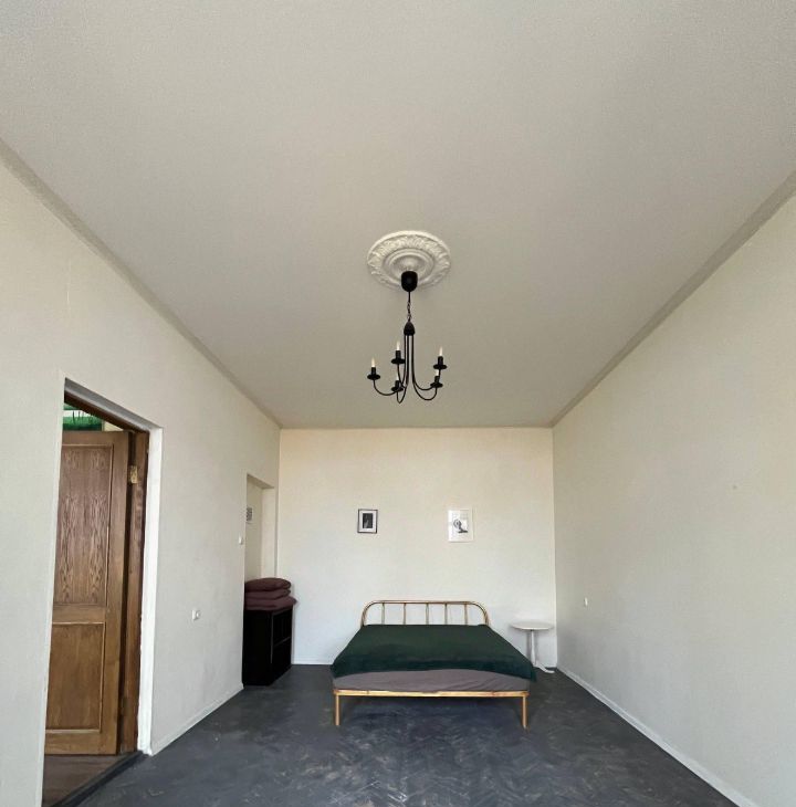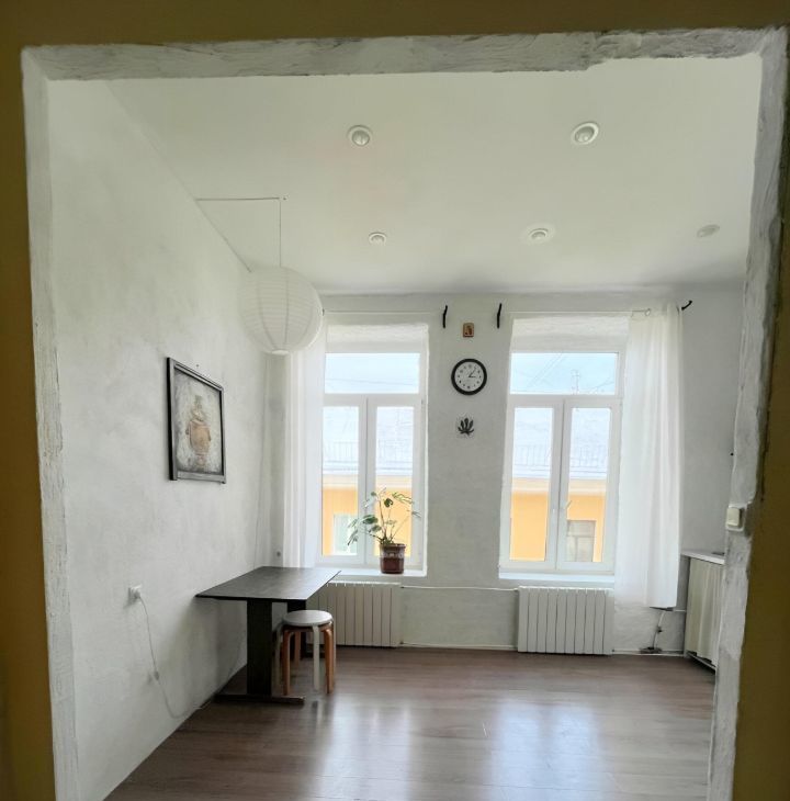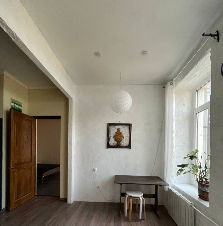 В квартире минимум мебели, ничего лишнего, но есть необходимое. Окна выходят в тихий уютный двор, вид на небо и крыши.