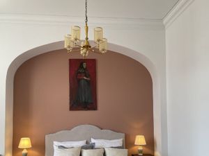 Апартаменты с дизайнерским ремонтом и мебелью: зона с двух-спальной кроватью, столовая зона с встроенной кухней и зоной отдыха.